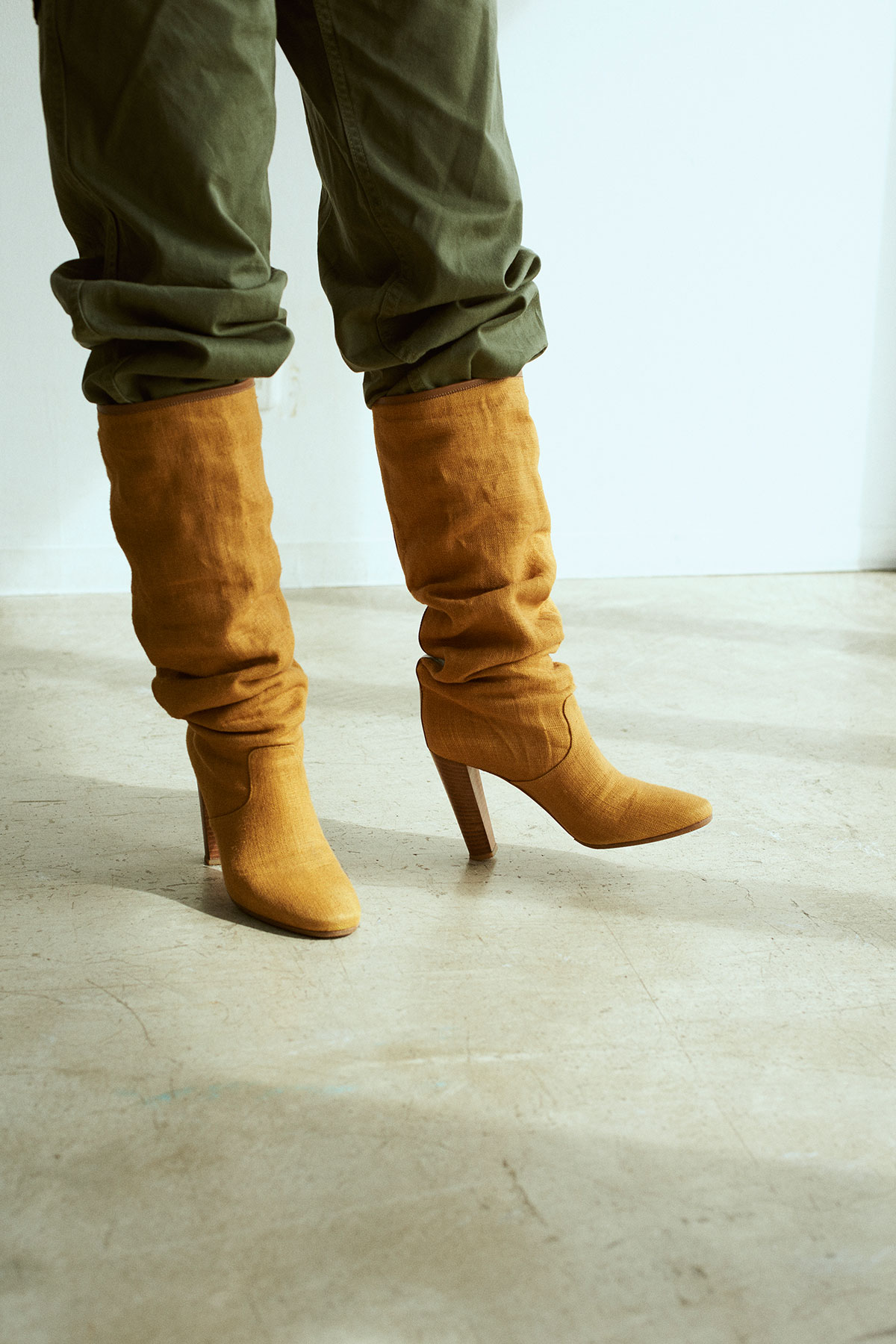 HERMESのロングブーツは表地がキャンパス地のような風合い。