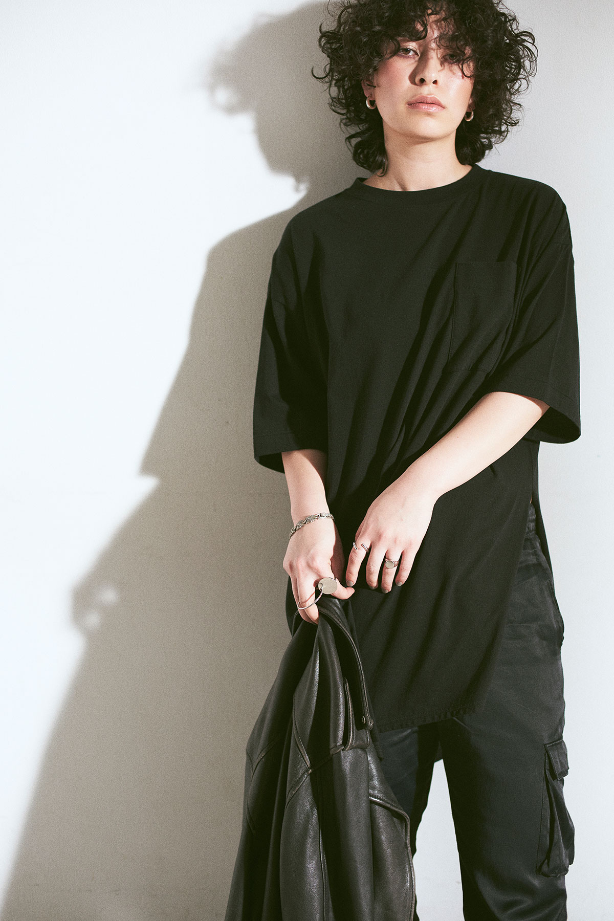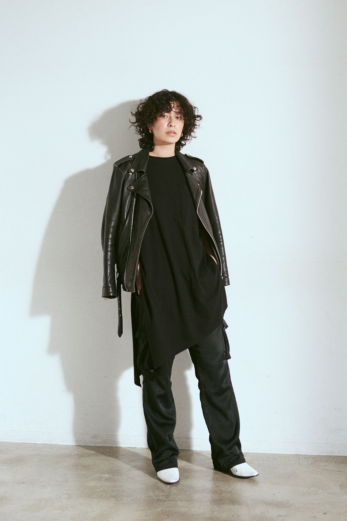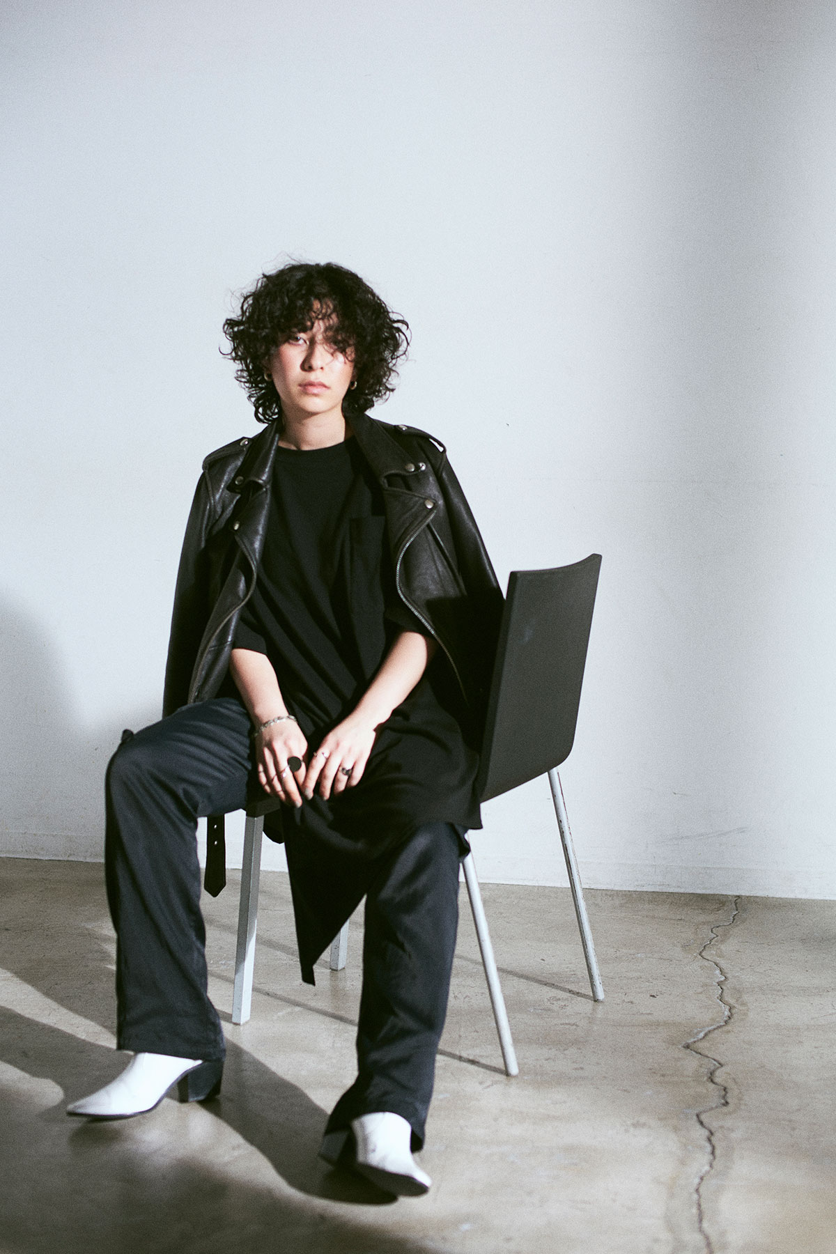 旬のカーリーヘア、ハンサムな顔立ちをよりモードに仕上げるモノトーンコーディネート。