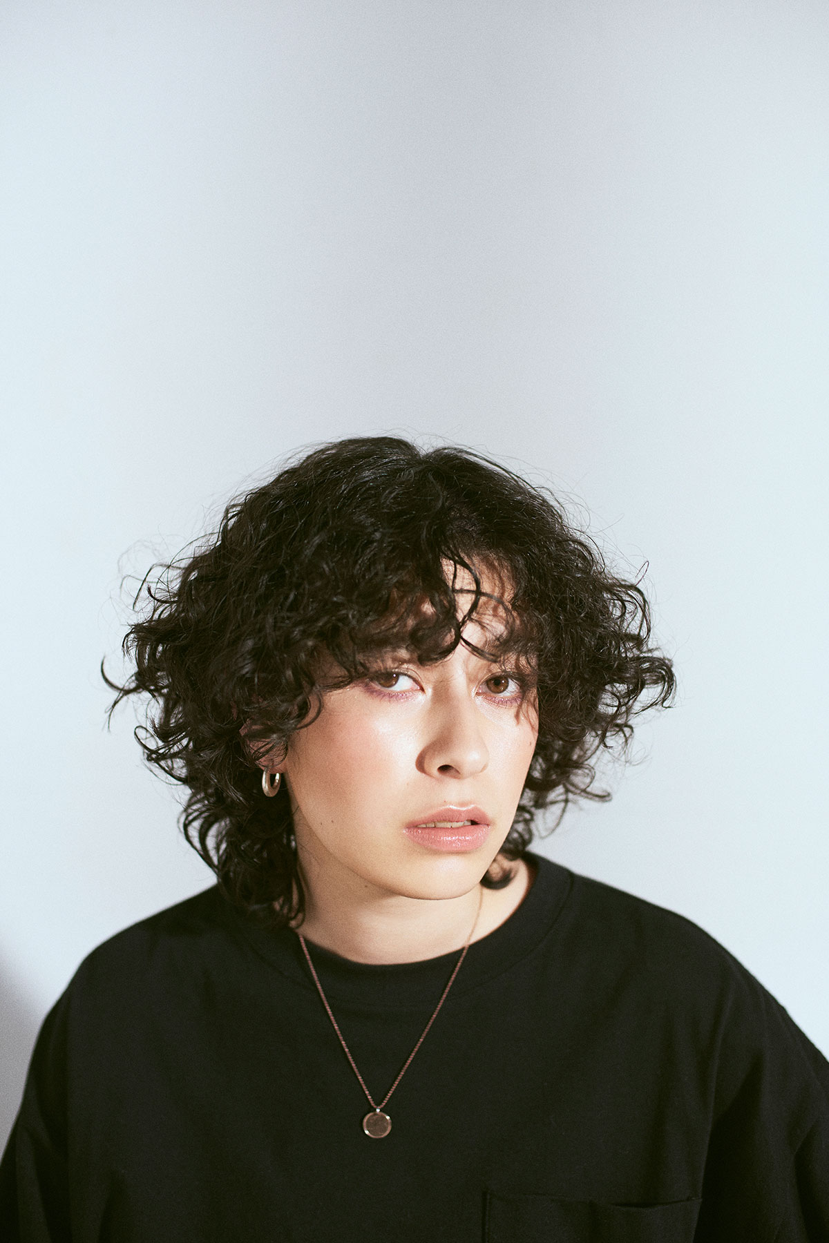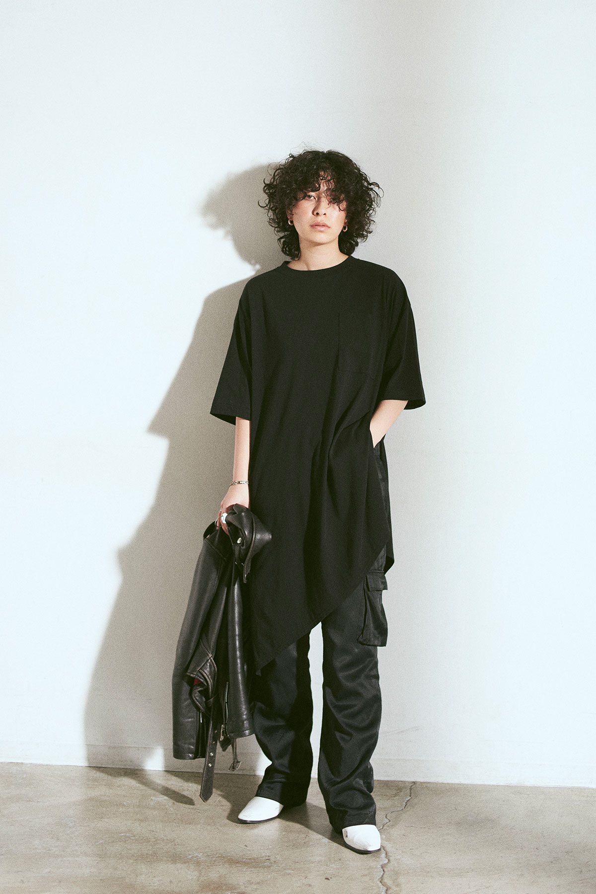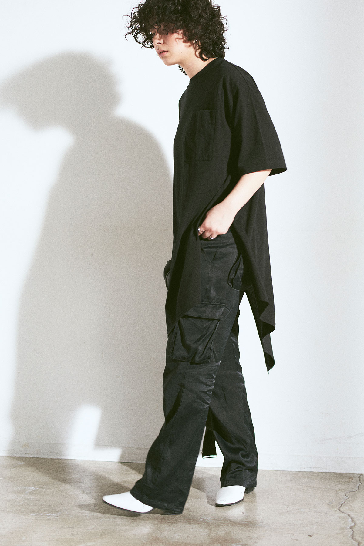 旬のカーリーヘア、ハンサムな顔立ちをよりモードに仕上げるモノトーンコーディネート。