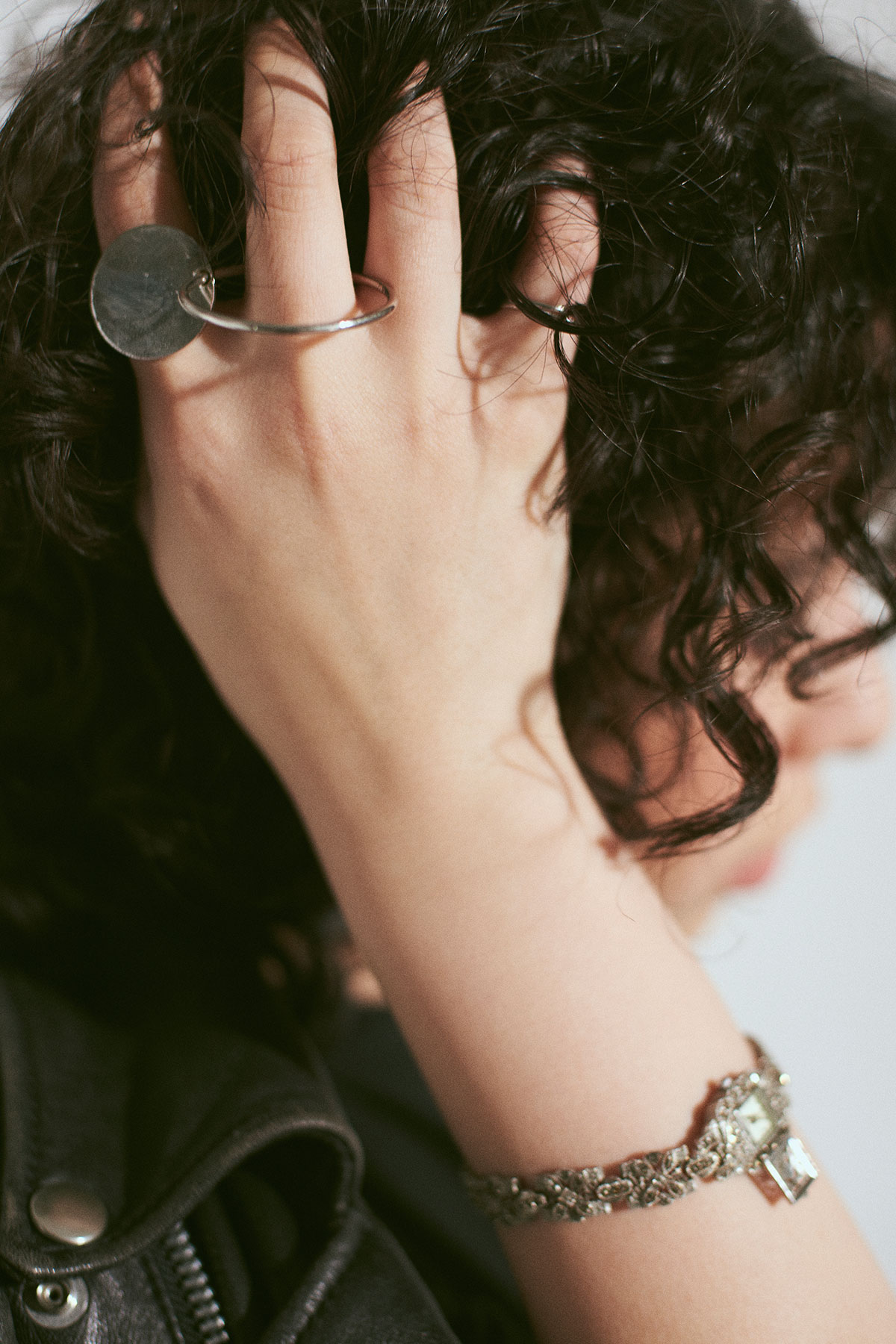 オールシルバーで統一した手元のアクセサリーはアーティなフォルムのもの、アンティーク感溢れるものをバランスよくミックス。