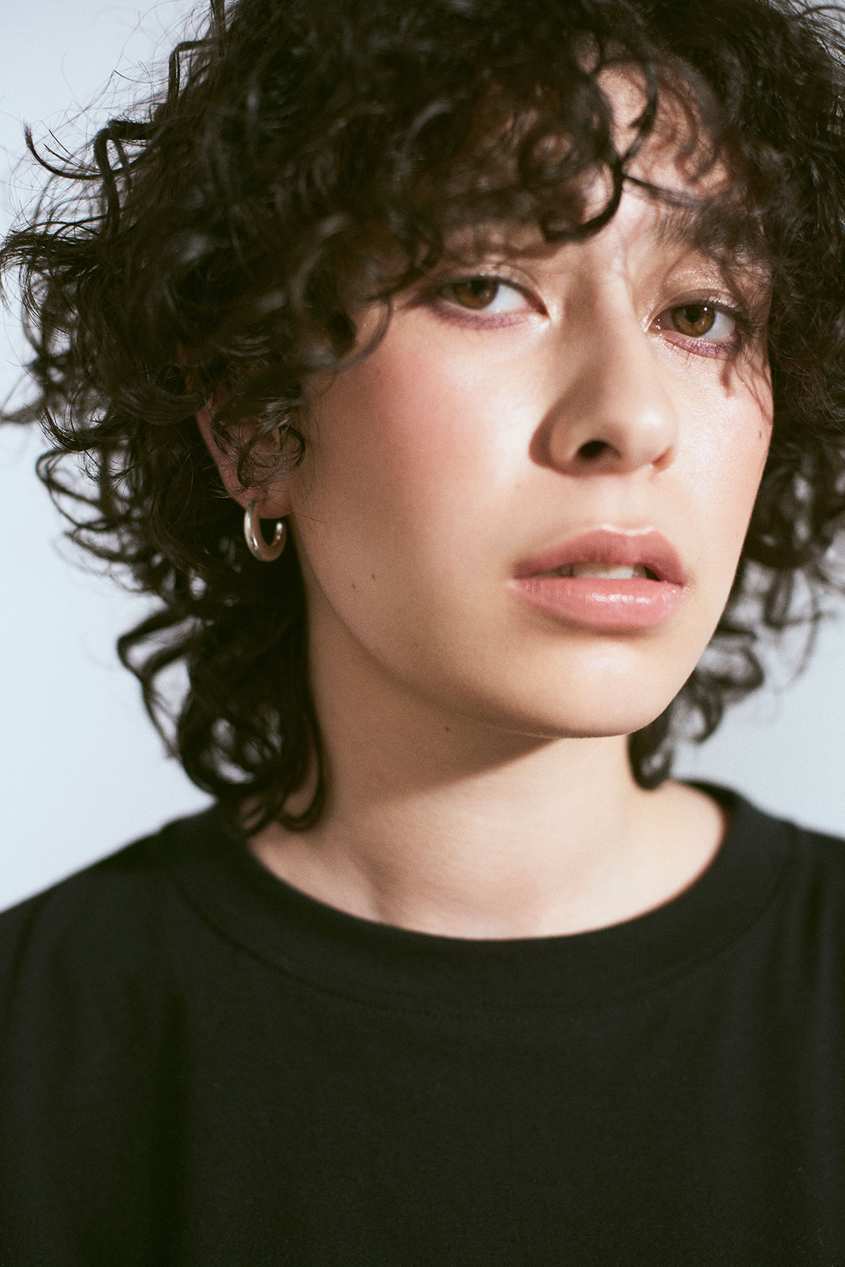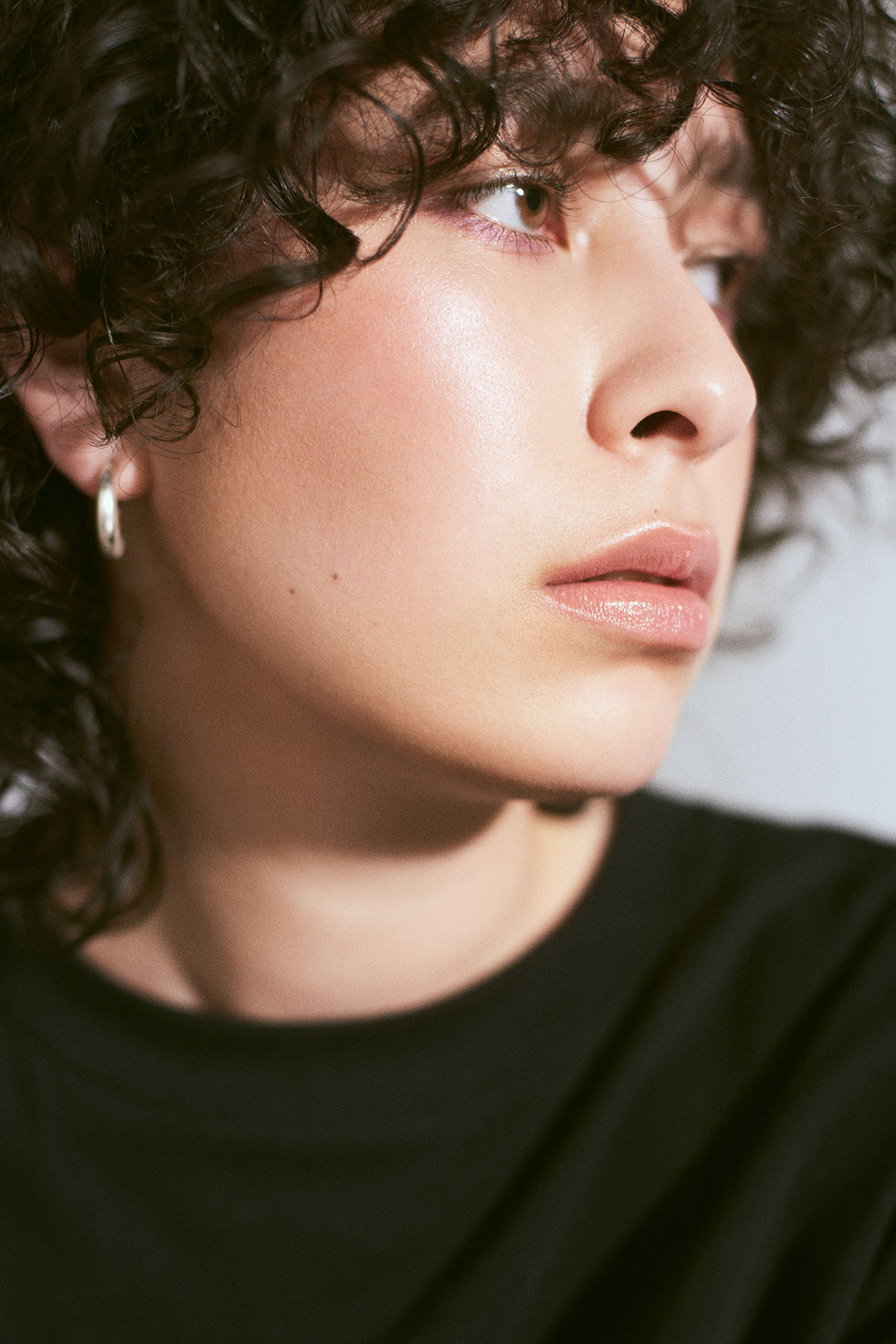 カジュアルなTシャツとのミックス感を楽しむにエレガントなメイクでバランスを。