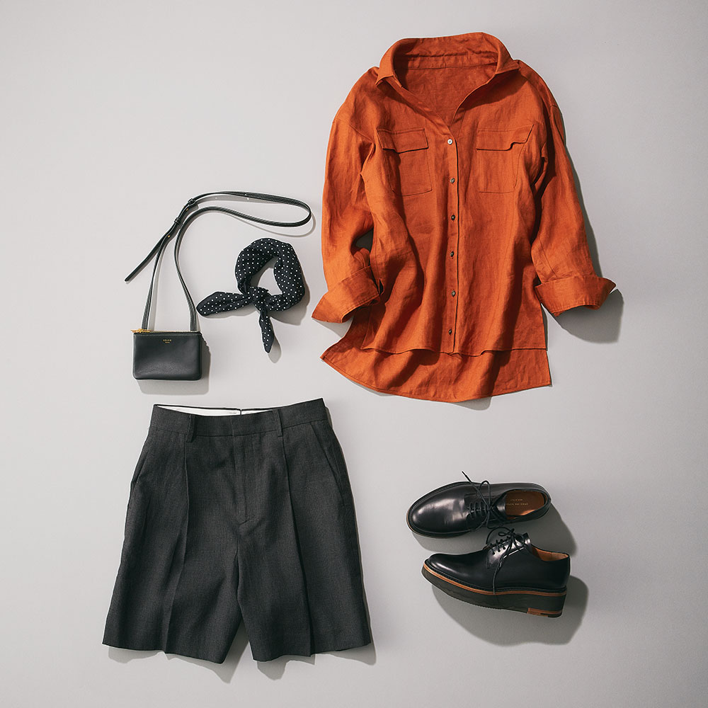 ハーフパンツもリネンシャツとの合わせで子供っぽくならずに知的に。