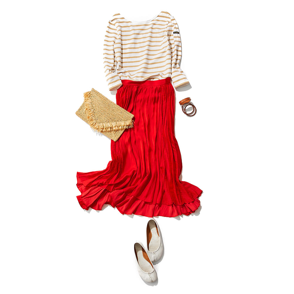 赤のスカートはカジュアルなボーダーとのコーディネートでも充分フェミニン見えします。