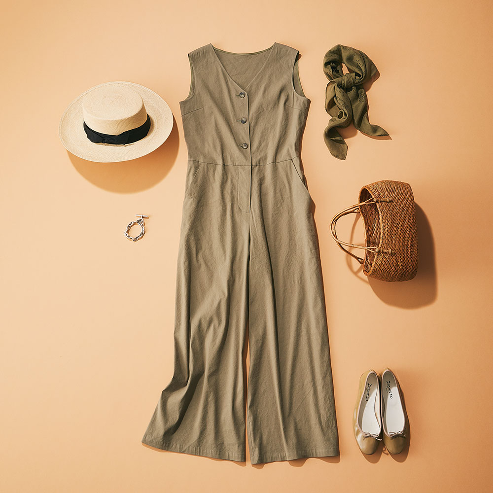 スカーフ使いもコンビネゾンとなればコンサバすぎずにまとまります。