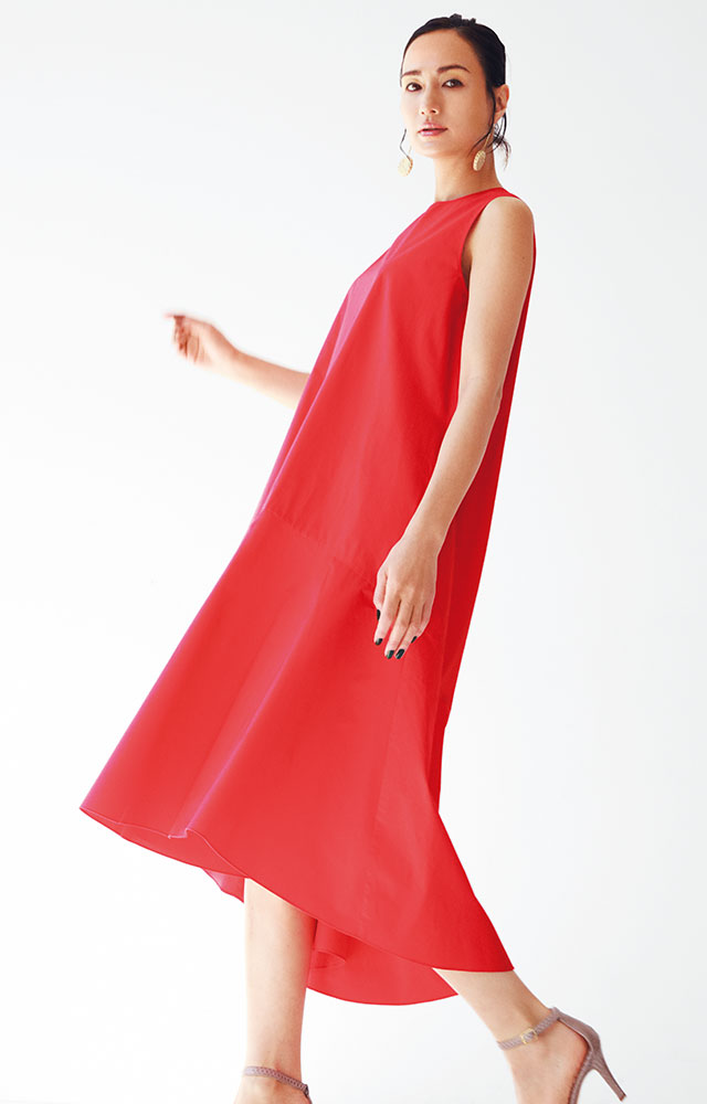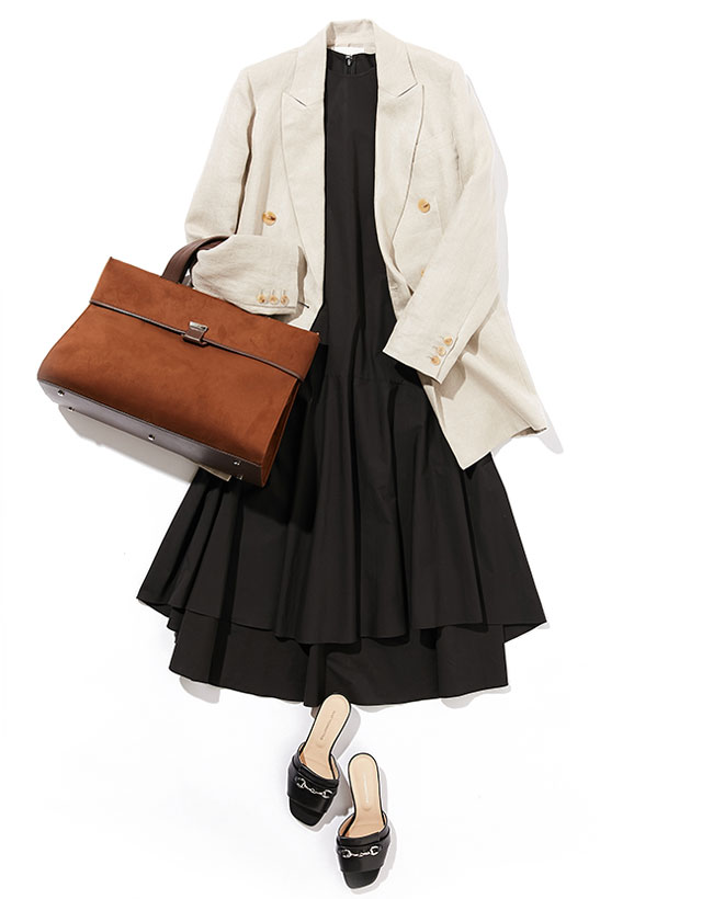 シャリッとした質感のきちんと見える生地だから、ジャケットを合わせもバランスがいいドレスですよね。オフィスにはもちろん、娘の学校行事にだって行けそうです。子どもと遊ぶときはスニーカー必須なんですが、そんなラフな足元でも大人っぽいフェミニンさを出してくれそうですね
