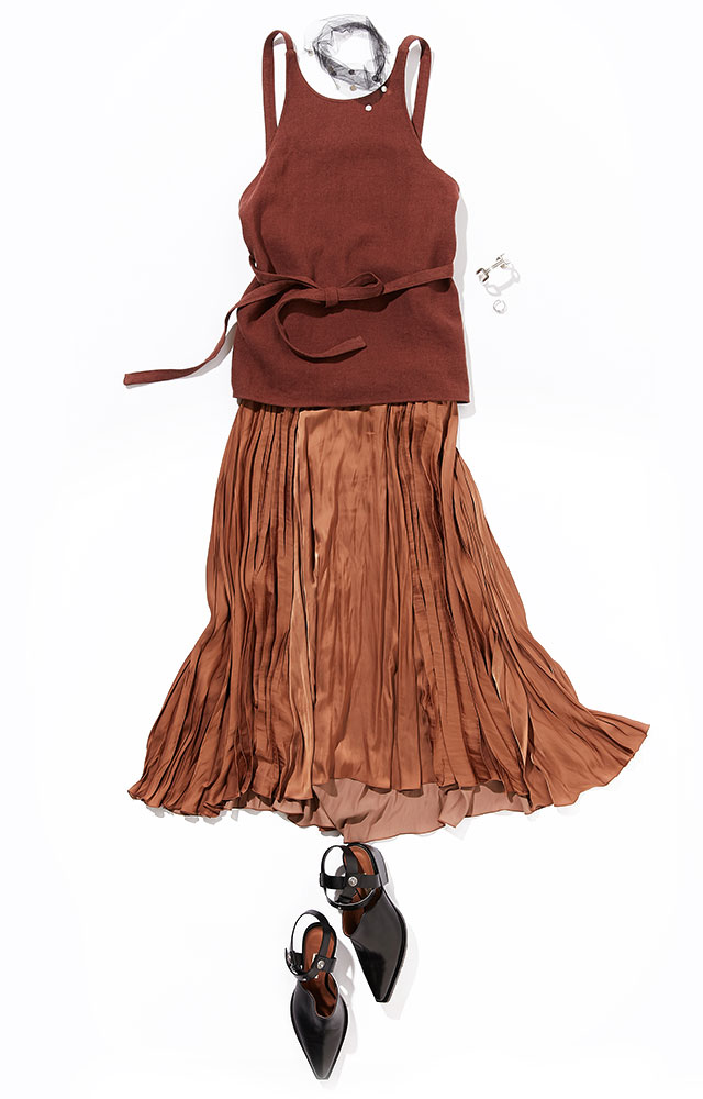 シックなブラウンコーデは、この夏にしたい大本命!着こなしをドラマティックにしているのはサイドのプリーツ加工が美しいスカート。動くとゴージャスに広がるのに、落ち感のある柔らかい生地なのですっきり着られるのもいい!
