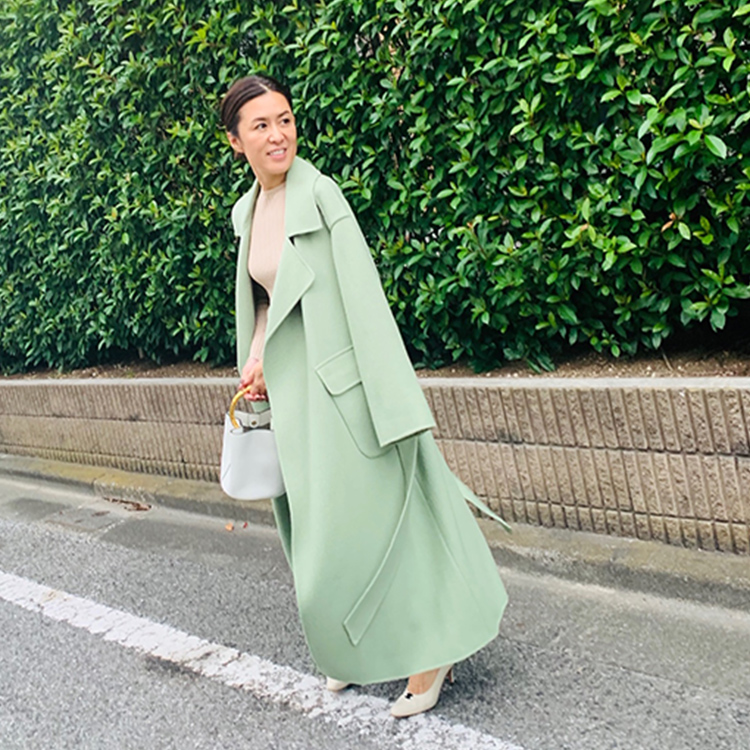 実はあまり見たことがないグリーンのコート。ファンデーション前のコントロールカラーにもなっている色で、くすみや赤みを消して、透明感をアップしてくれる効果があります。だから、あえて黒を使用しないコーディネートに。トーンが少しずつ違うグリーンを注意深く重ねて、繊細でライトな印象に。