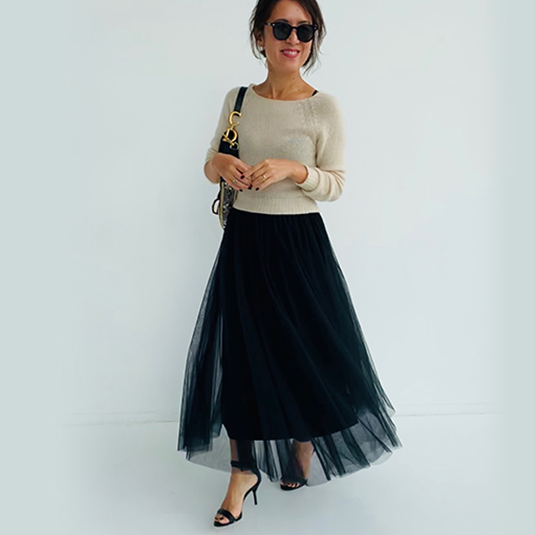 着るだけで、歩くだけで気持ちが上がるチュールのスカート。チュールがさらさらと揺れる、歩く姿も。そしてふんわりと裾を広げた座る姿もきれいで、本当に幸せになります。バックオープンのカシミヤのニットと合わせて△のシルエットに。