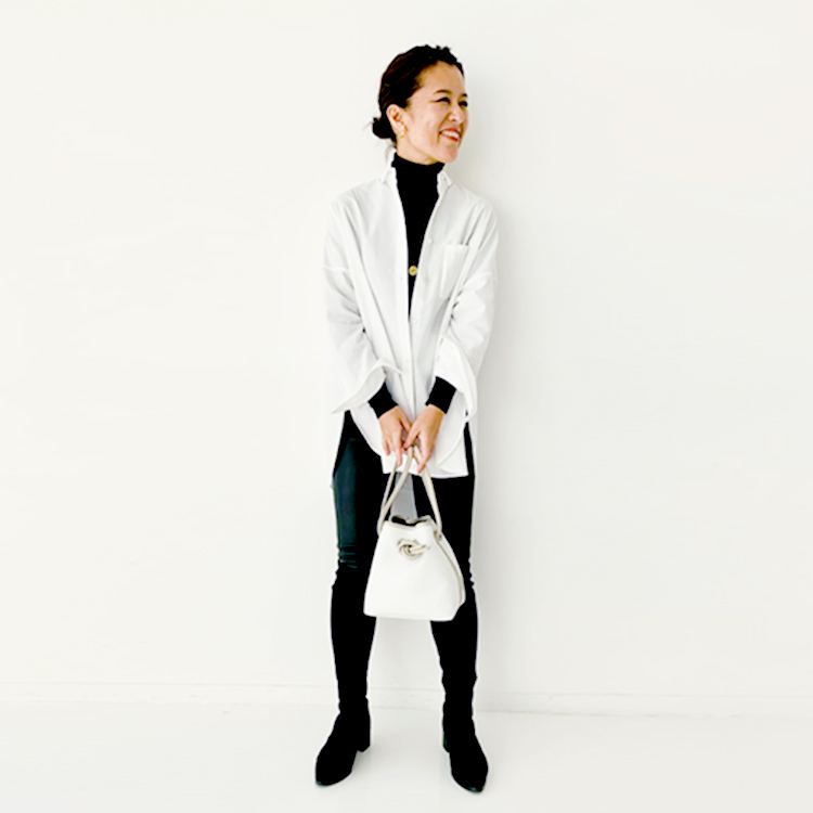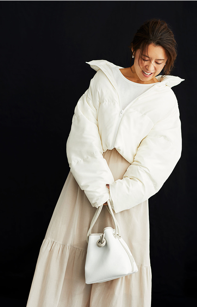 白の分量を大きくすればするほど、甘さや華やかさが増します。ダークな色を選びがちなダウンジャケットも、「存在感が大きいからこそ、白に決定」。その甘さ、華やかさをさらに強調するために、バッグも白に。