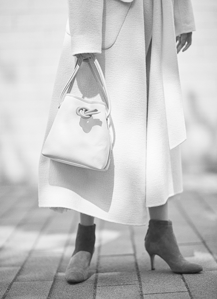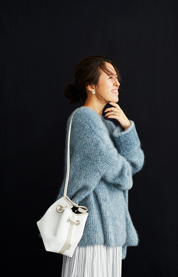 ふわふわのニットに、少し光沢のあるスカート。さまざまな素材を自由に重ねた、冬の空みたいなスタイリング。このフレッシュ感、透明な冷たさを、白のバッグで際立たせて。あえてラフにもつことで、スカートの表情が、ラフに少しくずれます。