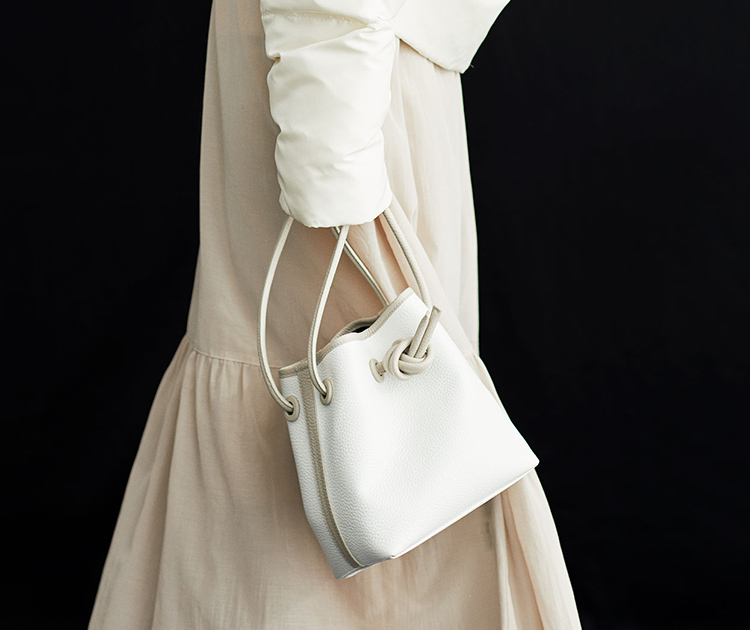 身体の中心に位置するバッグは、スタイリングに与える影響がとっても大きい。そのフォルム、色、素材、全てが「とても目立ちます」。無難に無難に、と黒に落ち着きますが、黒はとても強く手難い色。どんなコーディネート、どんなシーンにも合うのは、実は白なのです。横顔を照らすパールのピアスのように、その人自身を明るく見せてくれるからこそ、その色みはディレクターのKANOKOさんとも協議を重ねました。くすみのない白をベースに、トリミングをアイボリー色に。ほとんど色のコントラストがない2色だから、主張し過ぎず、けれどもシャープな印象も生まれました。