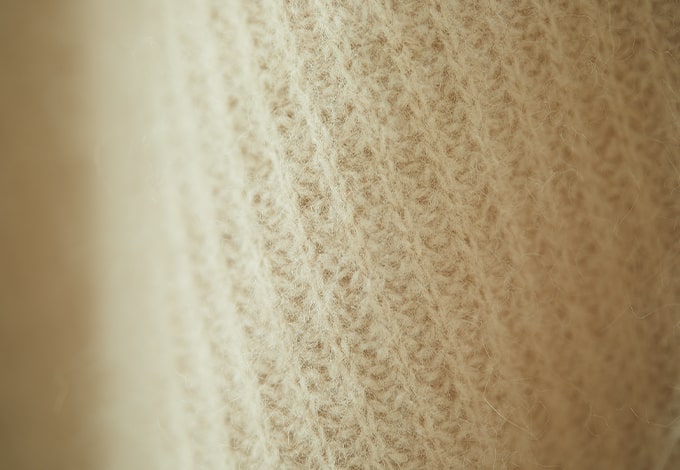 岩崎はい、素材としてはアンゴラによく似た風合いですが、アンゴラよりもさらに柔らかいのが特徴です。このニットは、そうしたラクーンの原毛の中でも、とりわけ柔らかくて細い毛を選りすぐって使っているので、肌に当たってもチクチクすることはありません。それに、毛が抜けにくい。毛足の長いニットというのは、どうしても毛が抜けやすいもので、例えば外出先でコートを脱いだら、コートの裏に毛がたくさんついてしまった……なんて経験があったりしませんか?