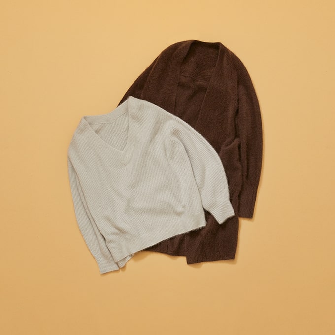 ニットの中では珍しいラクーン素材は、長い毛足が特徴で、保温性にも優れている素材。その手触りはカシミアに近いなめらかなタッチで、かつ、毛抜けしにくいというメリットもあるんです。そんな優秀素材で作った、2型のニットをご紹介します。