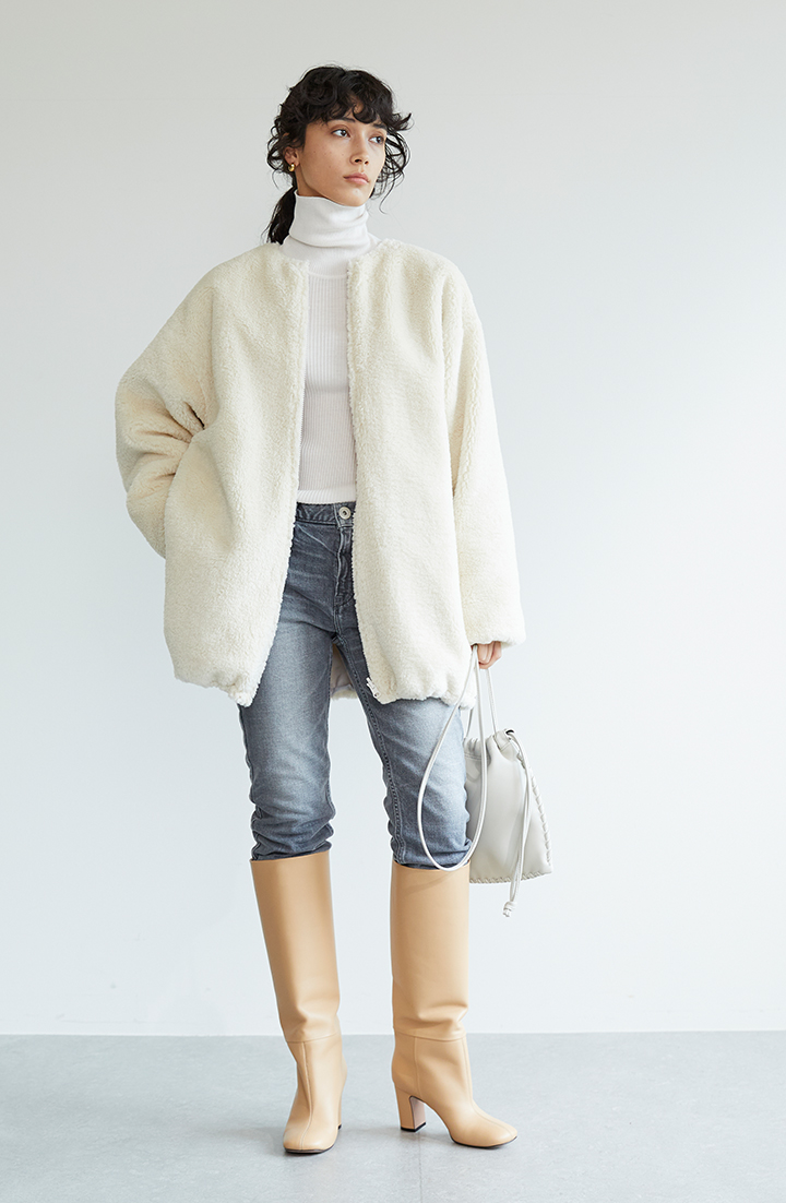 前を閉めて着ると、ボアの質感が引き立ち、ほっこり感がアップ。まるで毛布にくるまっているかのような、癒やしムードの装いに。ノーカラー(襟なし)だから、首周りは伸びやか。タートルネックを見せるコーデで、首周りレイヤードに仕上げられます。