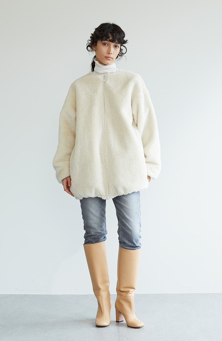 毛羽立ったボア面を表にして着ると、ボア特有のソフトな風合いが際立ちます。見るからにあたたかそうで、もちろん実際にぬくぬく。オフホワイトのやさしい色味はデニムパンツにもしっくりマッチ。カジュアル寄りのコーデにも、気品をまとわせてくれます。