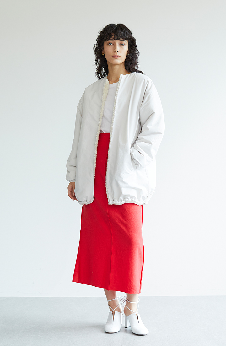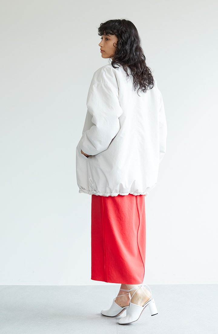 軽快なブルゾンに、あえてあでやかな赤スカートを合わせて、ずれ感を引き出しました。ブルゾン裾のドローコードを絞って、シルエットに丸みを出すアレンジも選べます。
