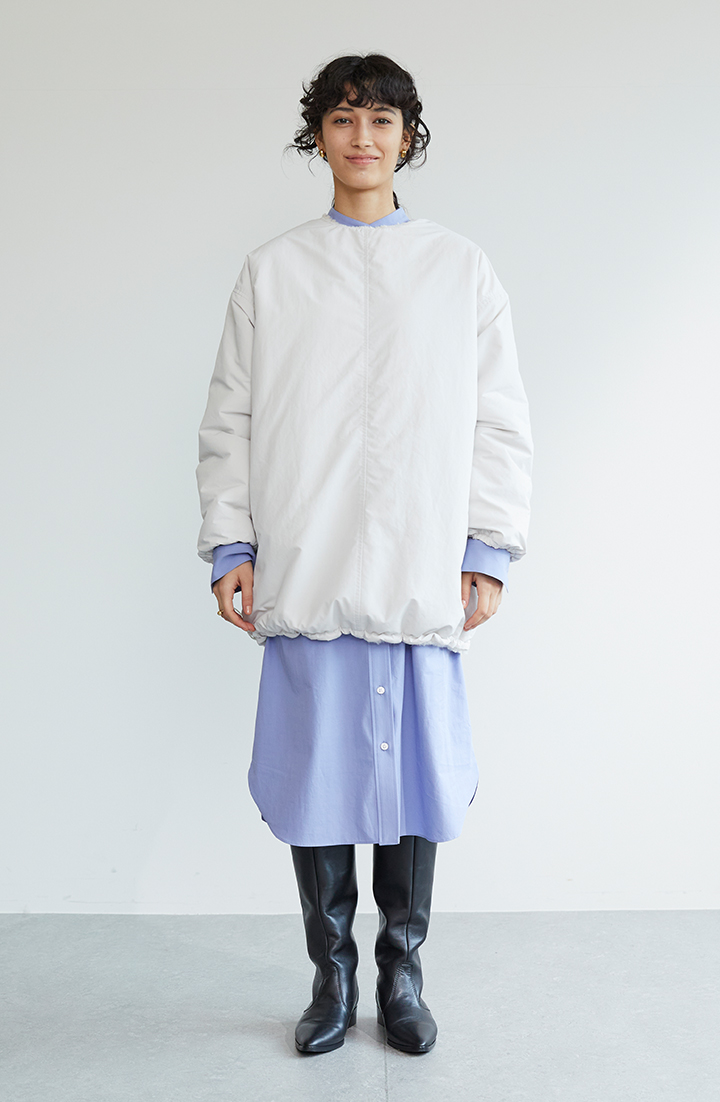 ブルゾンの着丈を生かすには、長めレングスのウエアとのレイヤードが効果的です。シャツワンピースに重ねて、丈違いを際立たせれば、全体の縦長イメージが強まります。