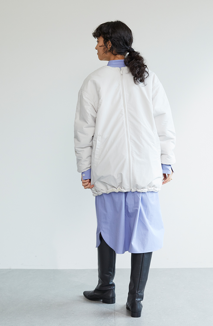 今度は表と裏をひっくり返して、タフタ生地側を表に出しました。同じ白でも、ボアとは風合いが全く異なるから、完全な別物として着回せます。ボア面が内側になっているので、あたたかさは格別です。