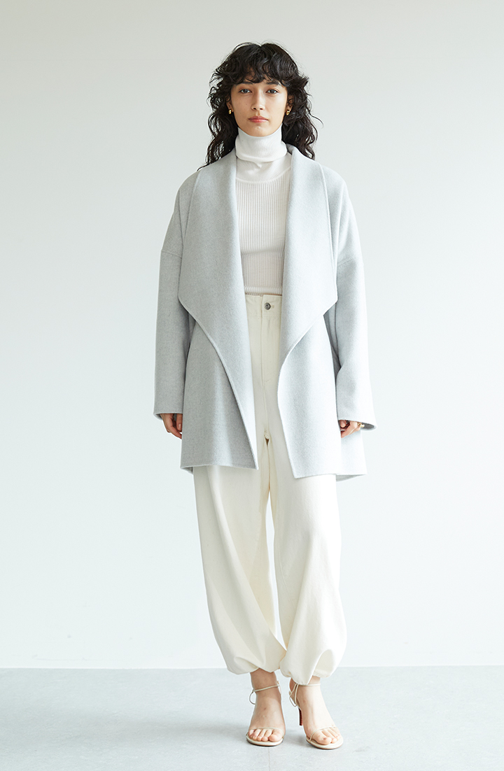 目を惹くのは、幅が広く、スカーフみたいに優美な襟。襟からつながった、正面の打ち合わせ部分もナチュラルにロールしていて、自然体の着映えを印象づけてくれます。