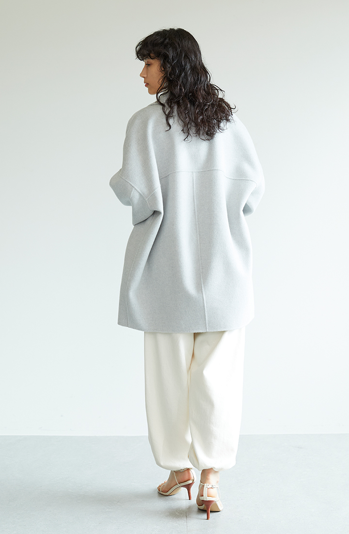 コートでありながら、ジャケット感覚で使いやすい羽織り物。程よい光沢を帯びていて、上品な質感だから、着て行く場面を選びません。腕を通すあたりを、ゆったりめに仕立ててあるので、楽ちんな着心地。厚手のトップスを着込んでも、腕周りに窮屈さを感じずに済みます。