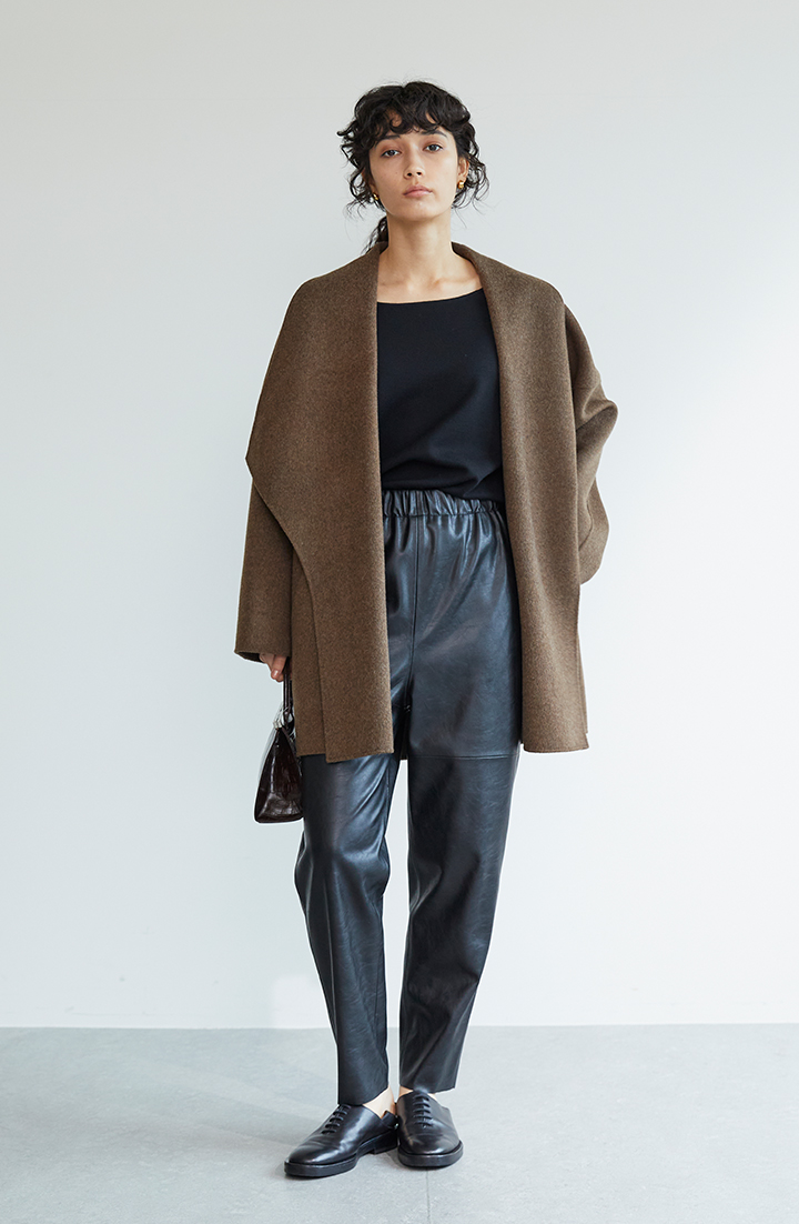 色違いのカーキコートには、フェイクレザーのパンツでマッチング。シックでアーバンなコーデにまとまりました。レザーパンツは本革ライクな風合いですが、実際はフェイクレザーだから、デイリーに着回せます。高い位置でトップス裾をウエストインして、コートの裾ラインとずらすことによって、レッグラインが伸びやかに映っています。短め丈のコートで使いこなしたいテクニックです。