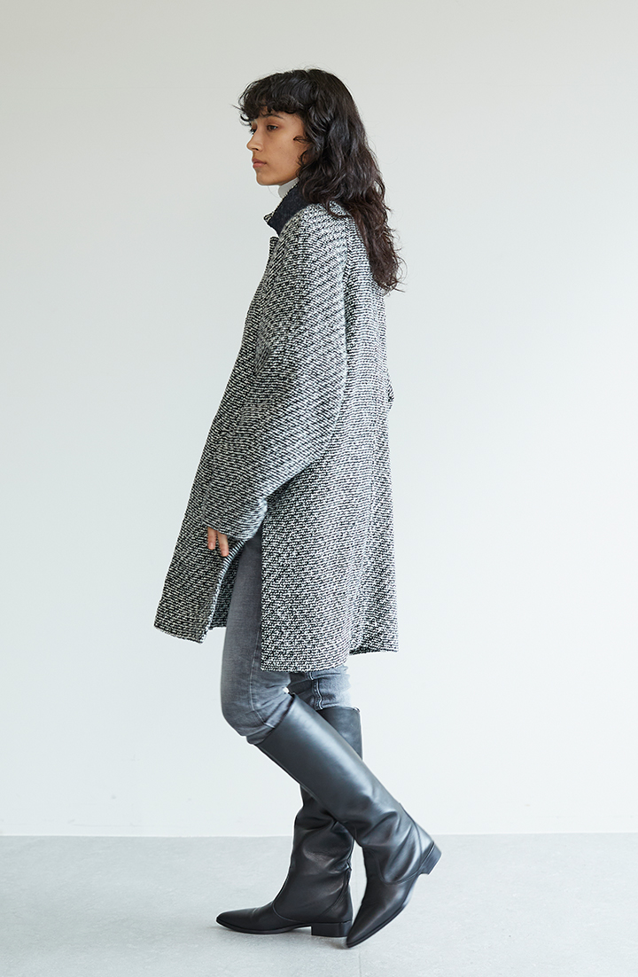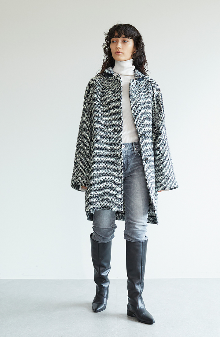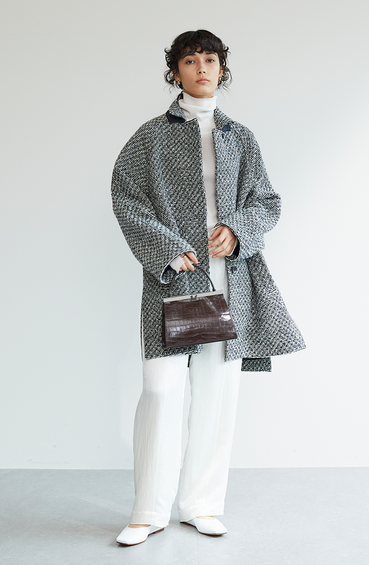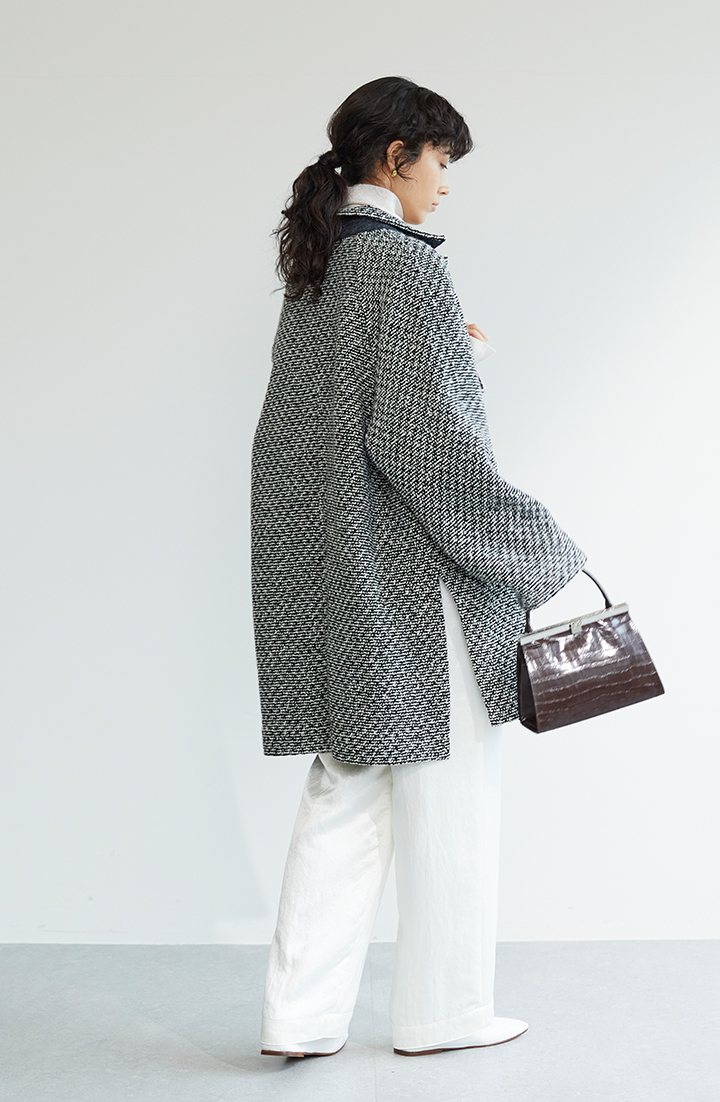 コートのベースカラーがブラックなので、上下ホワイトのコーデに重ねれば、きれいなツートーンで着こなせます。ツイードならではの張り感があって、コートルックに立体感が備わっています。