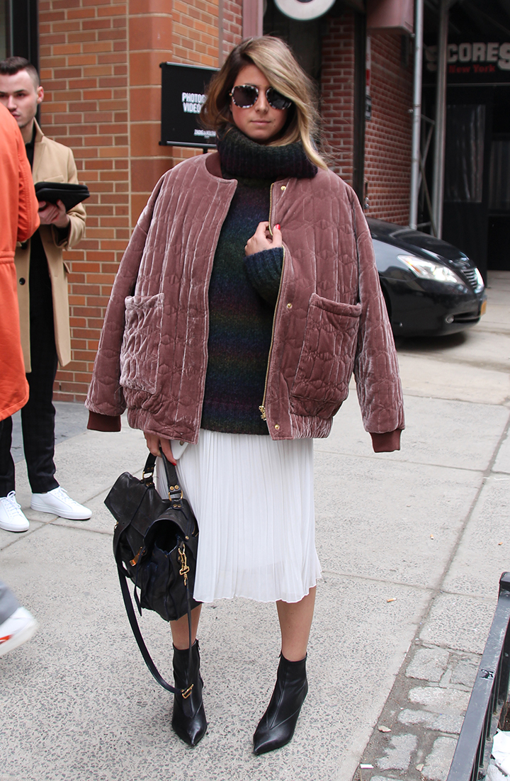 ベロア素材にキルティングを施した、ブルゾン系のふんわりアウターを、肩掛けで羽織っています。着こなしのポイントは、薄いシフォン生地のプリーツスカートとの組み合わせ。全く風合いの異なる素材同士のコントラストが際立っていて、適度な「ずれ感」が生まれました。腕を通さない肩掛けで羽織っているので、実際以上に量感が出て、腰から下がすっきりして見えます