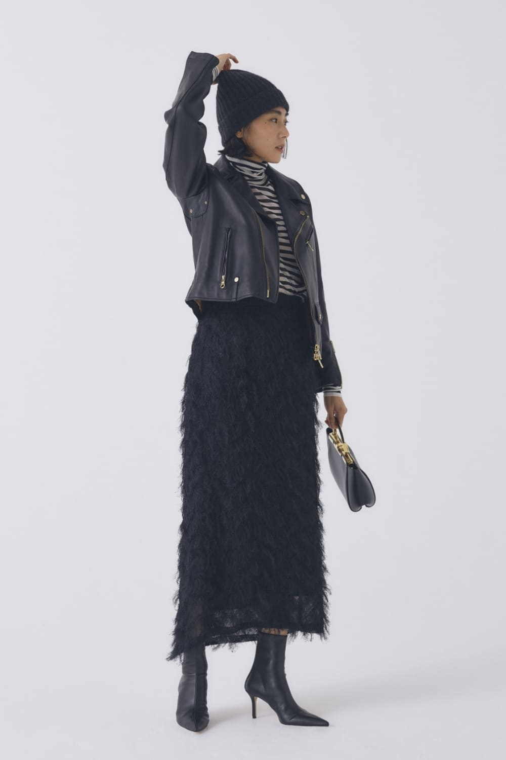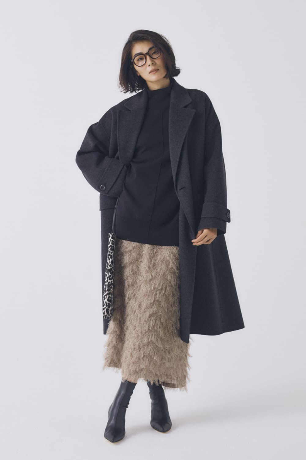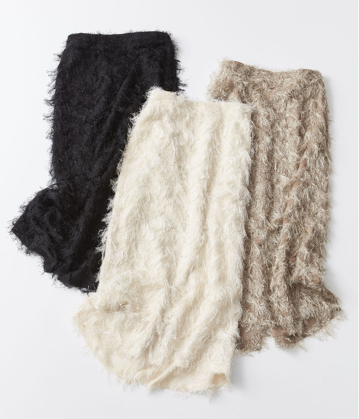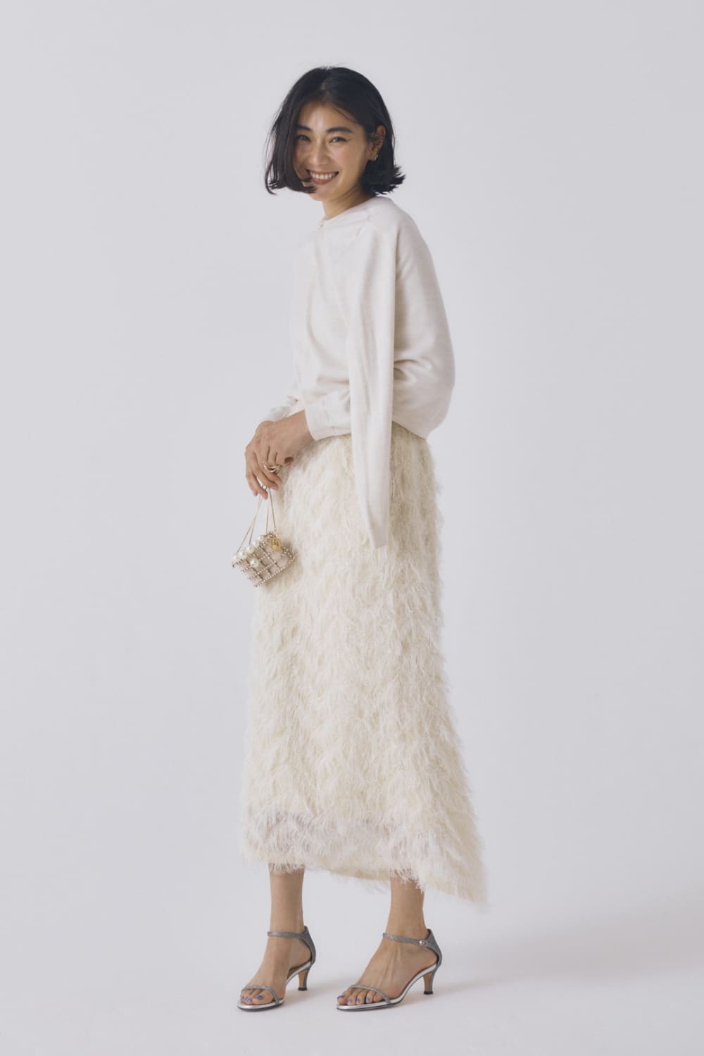 カジュアルなニットに合わせても、たちまち印象がドラマティックになるスカート。トップスの丈で、「羽根の分量」を調整すれば、着ていくシーンも選びません。華やかさ120%なのに、ウエストがゴムの仕様ではきやすいのもポイント。