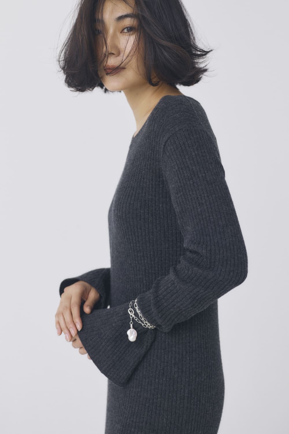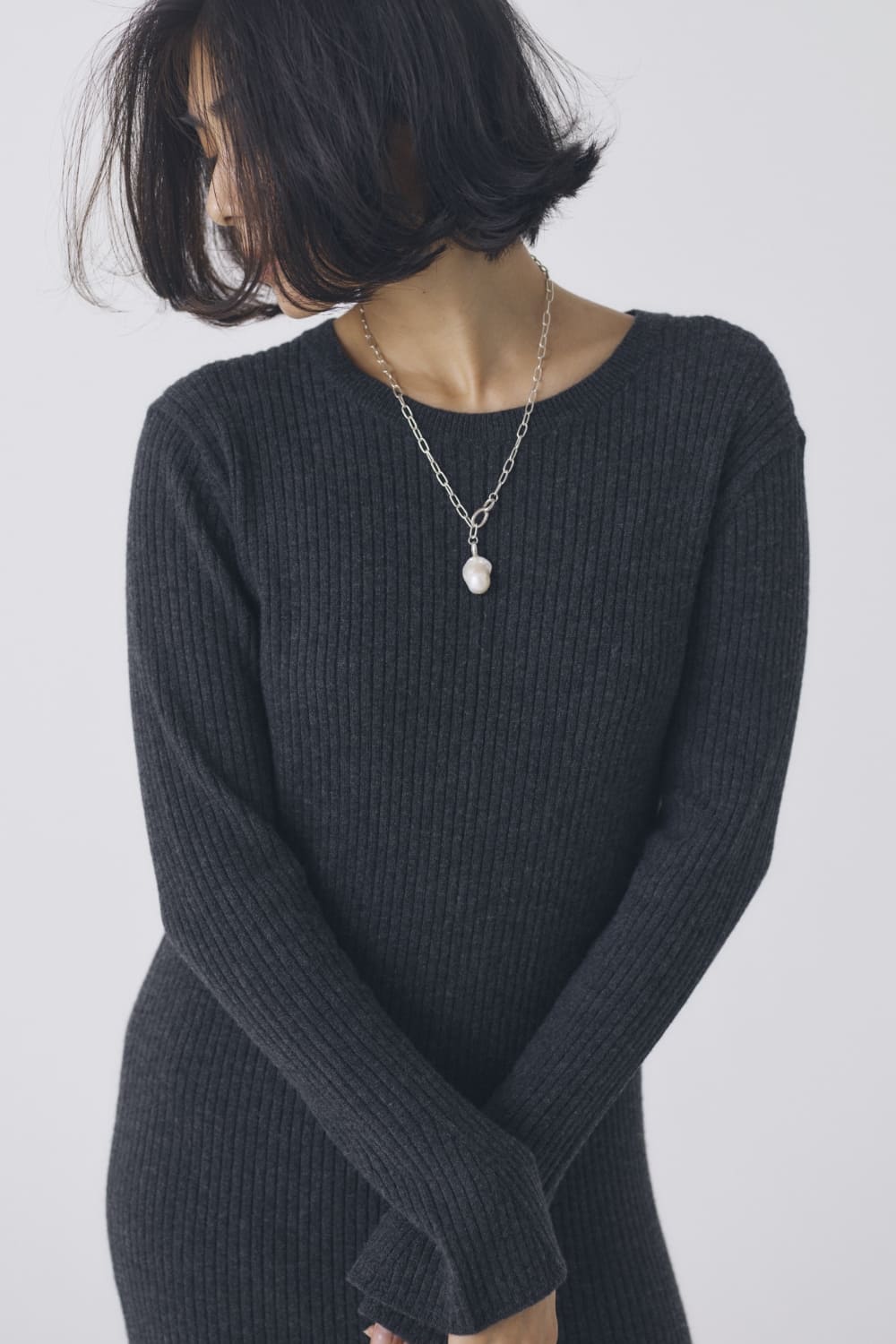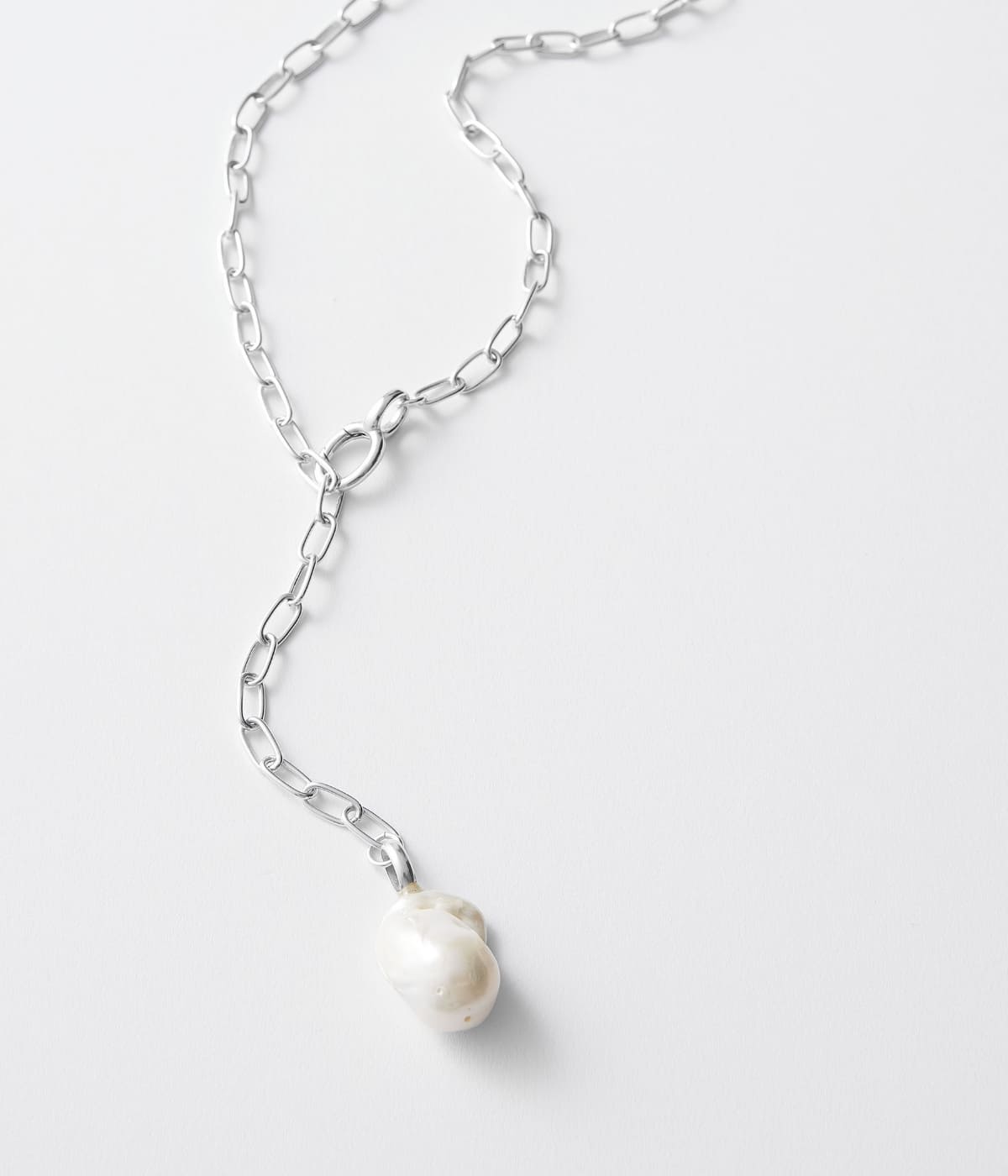 少しハードなシルバーのチェーンと、優美な淡水パール。硬軟あわせもったネックレスは、どこでも留められるので、ぐるぐるっと手首に巻いてブレスレットにもできます。バックオープンの服には、後ろに垂らしても。アイデア次第で無限に楽しめます。