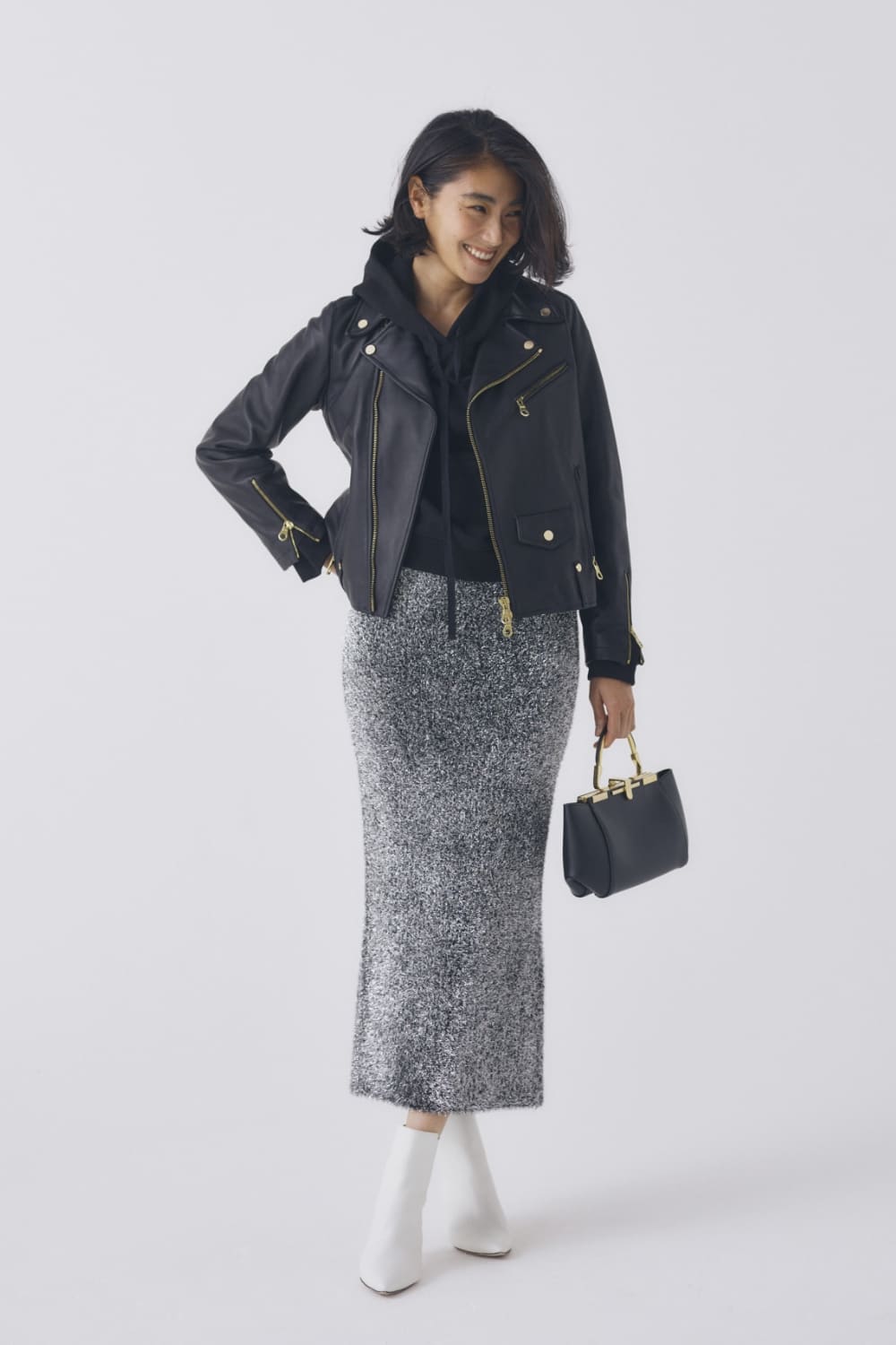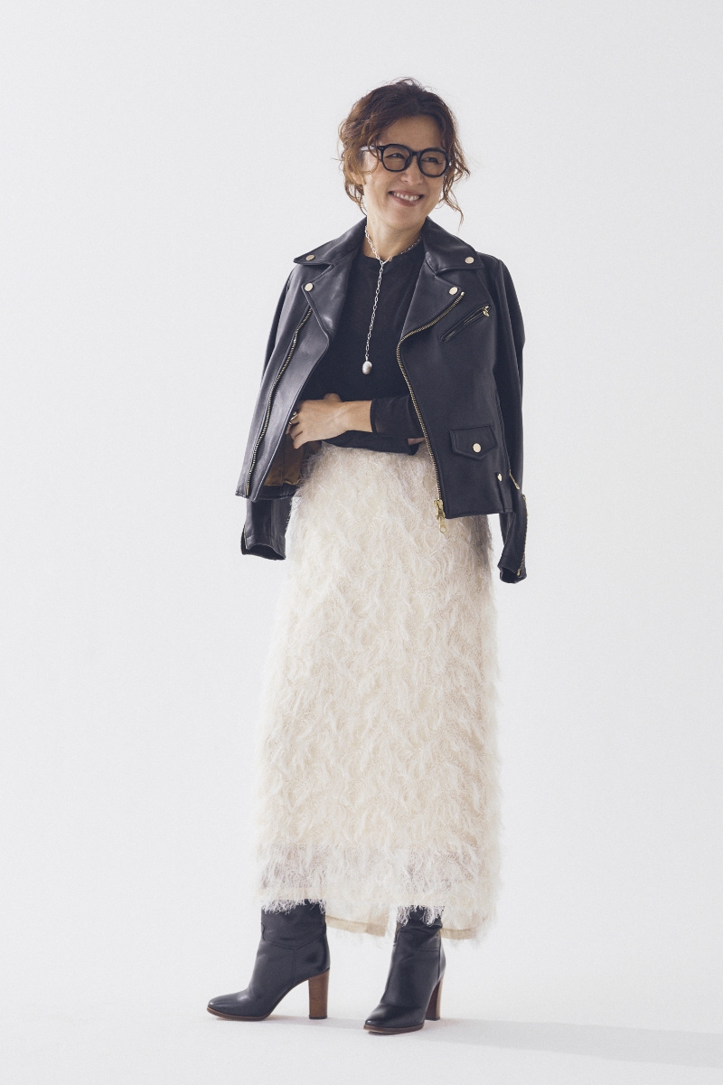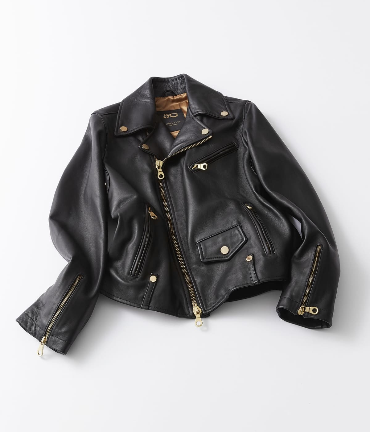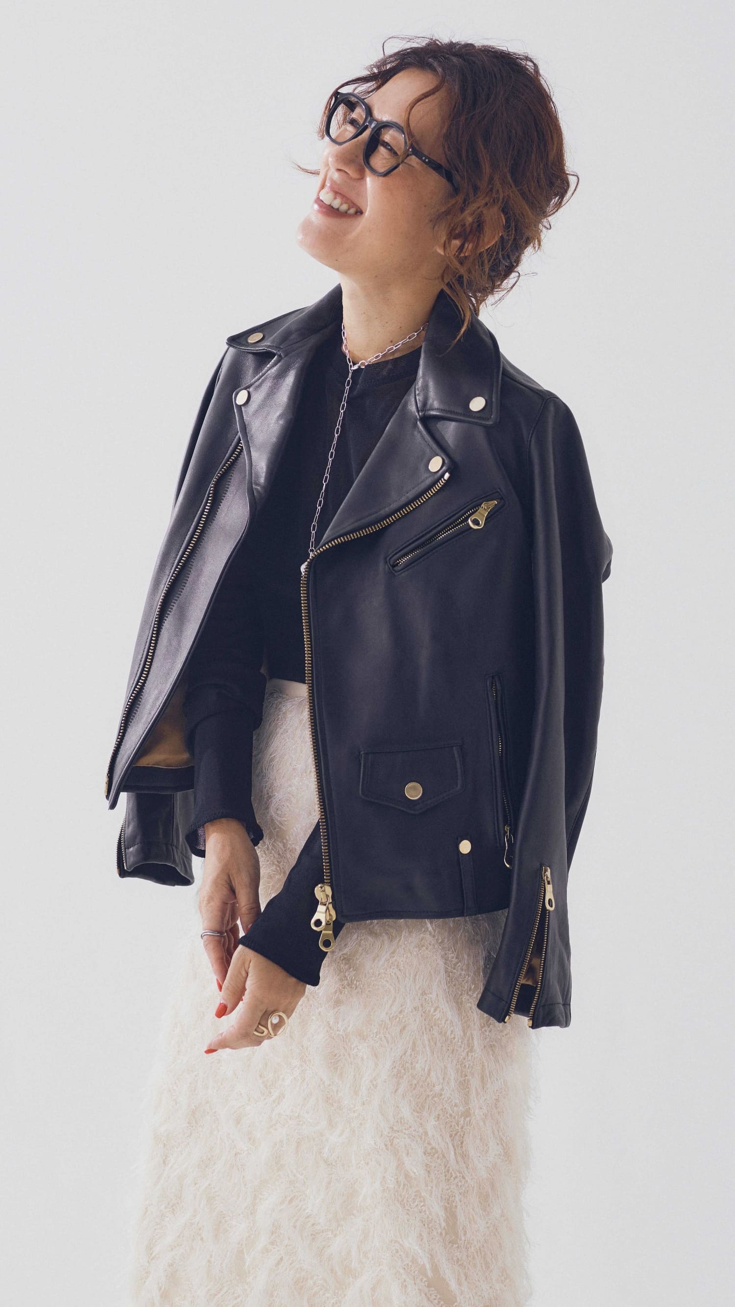 実は以前からもっている、チンクアンタのレザーライダース。レザーのファクトリーブランドだからこその上質さとデザインの美しさ。ゴールドの金具は、レザーのメンズっぽさを「華やか」に転換してくれます。着こむほどに身体になじむラムレザーは、一生大事にしたい。