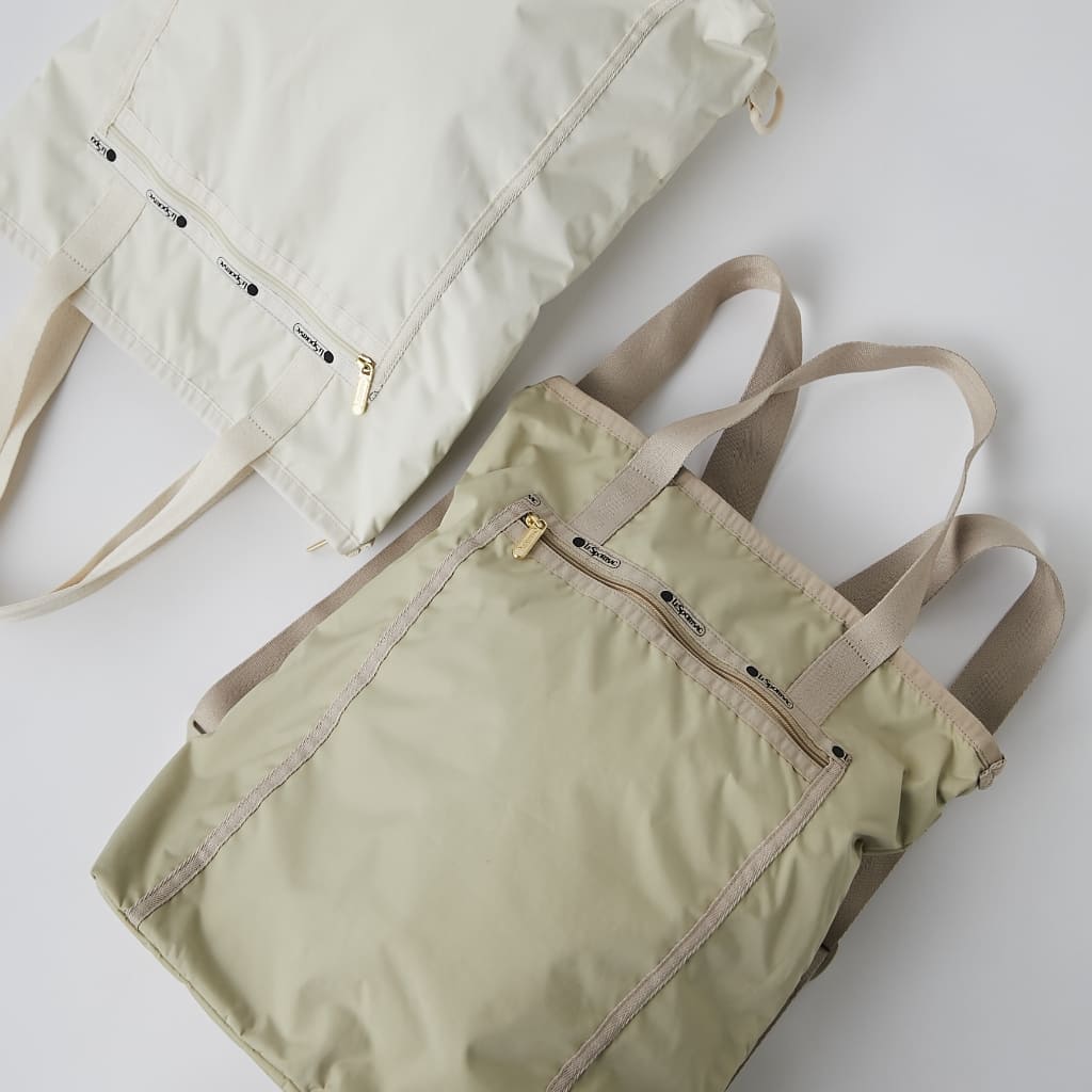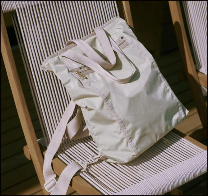 大容量のトートバッグは、ビーチバッグや長時間の移動など荷物が多くなるシーンでも安心。異素材のリバーシブル仕様で、その日の気分や用途に合わせて使い分けられます。