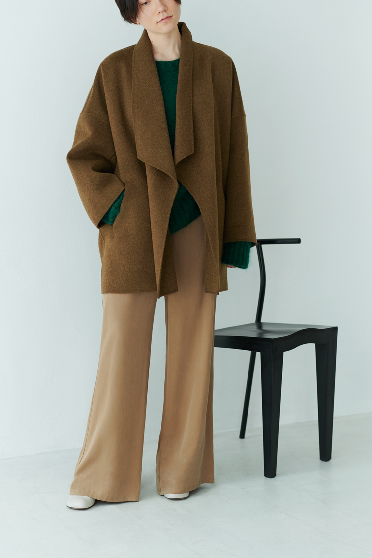 「モカカーキのショートコートは旬のブラウンやベージュにマッチし、ワイドパンツなどのボリュームのあるボトムともバランスを取りやすいのが魅力。どんなに気に入っていても、色合わせやシルエットに悩むコートだと難しいですよね。インとの組み合わせがぱっと決まるのが一番」。