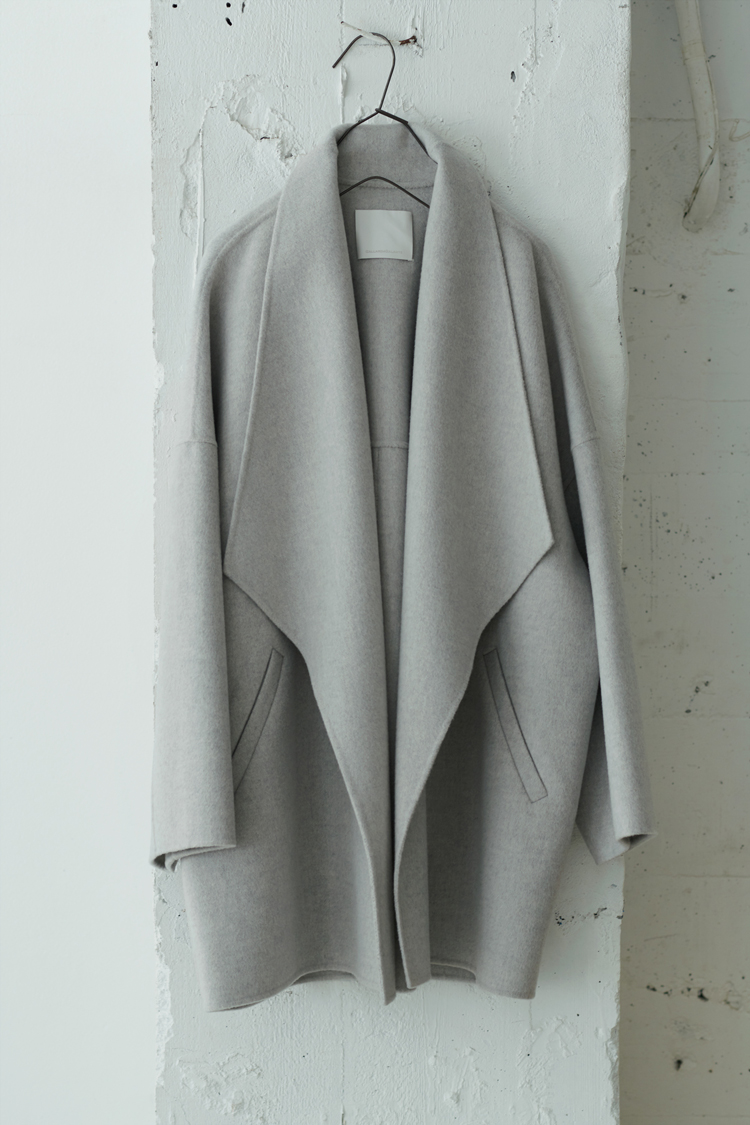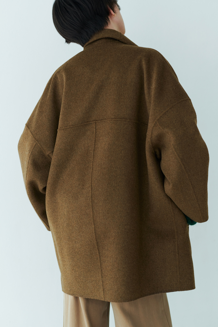 繊維が細く、なめらかで艶のある上質なウールを贅沢に使用したショートコート。しっかりと厚みのあるリバー素材を軽やかな一重仕立てに。体をゆったりと包むビッグシルエットで、アーム部分もワイドな仕上げに。厚手ニットの袖通しも良く、もたつかない。