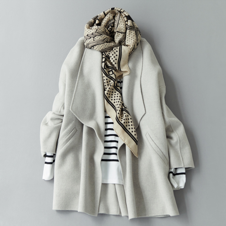「明るくソフトなライトグレーは白の延長で取り入れられる色。地味に見えず、着こなしの明度が上がるのがいいですね。ボーダーとのデイリーなスタイルもリッチに見えて、気分が上がります。カジュアル派の人にもオススメですよ。大判のシルクカシミヤストールをラフに巻くのもポイントです」。(村山佳世子)