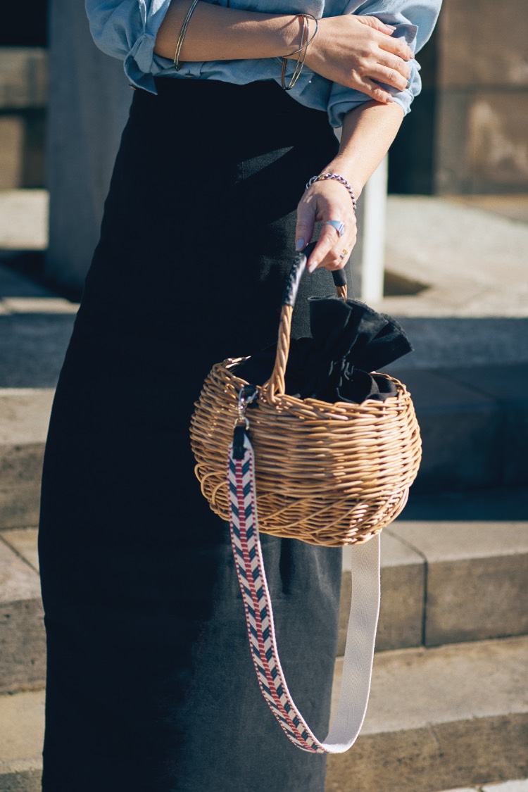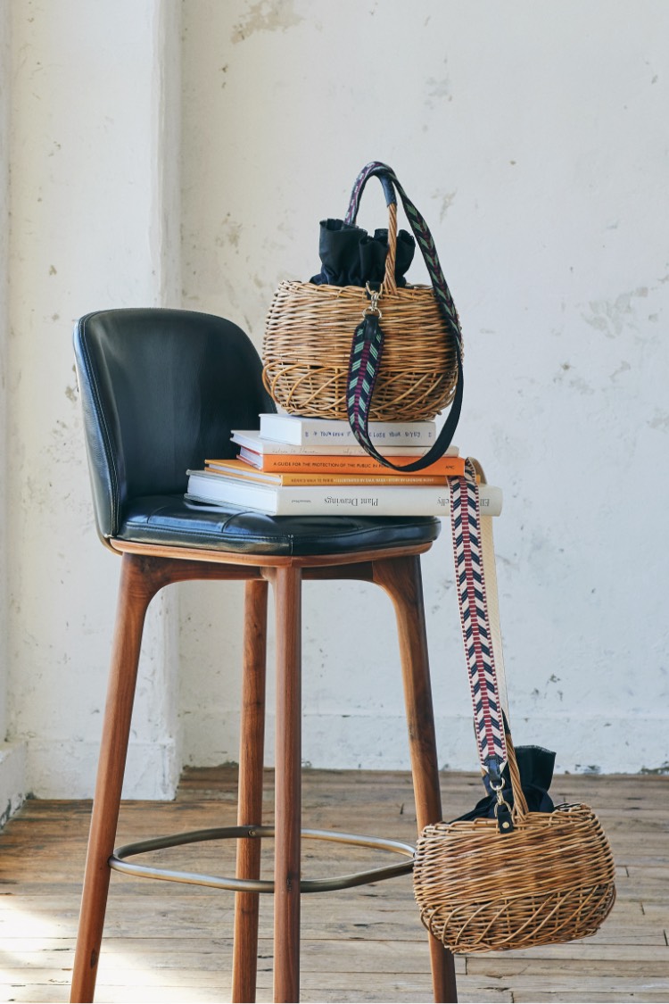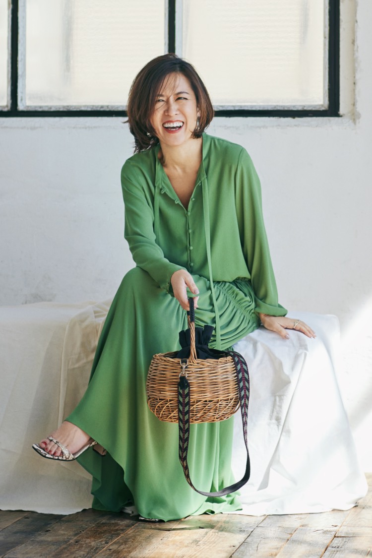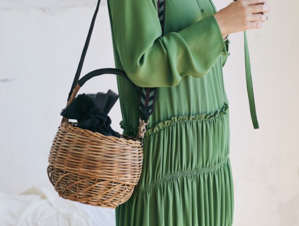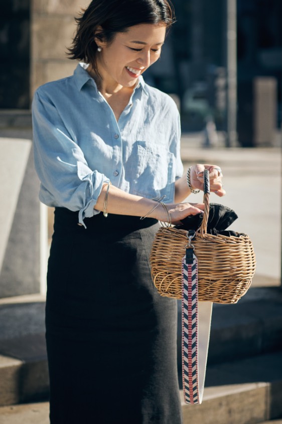 「我ながら、本当に可愛くできたかごバッグ。そう、コロンとした形、中にセットされた黒のリネンの巾着が“キュート”な印象を作り、リアルレザーのポイントやエスニックなストラップは、少し強めのアクセントに。