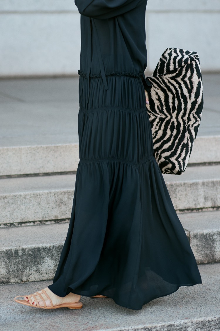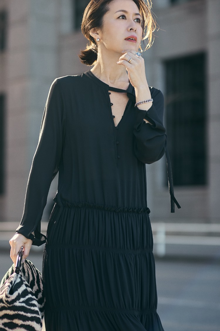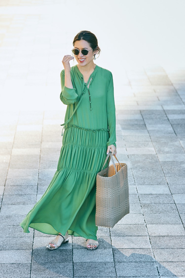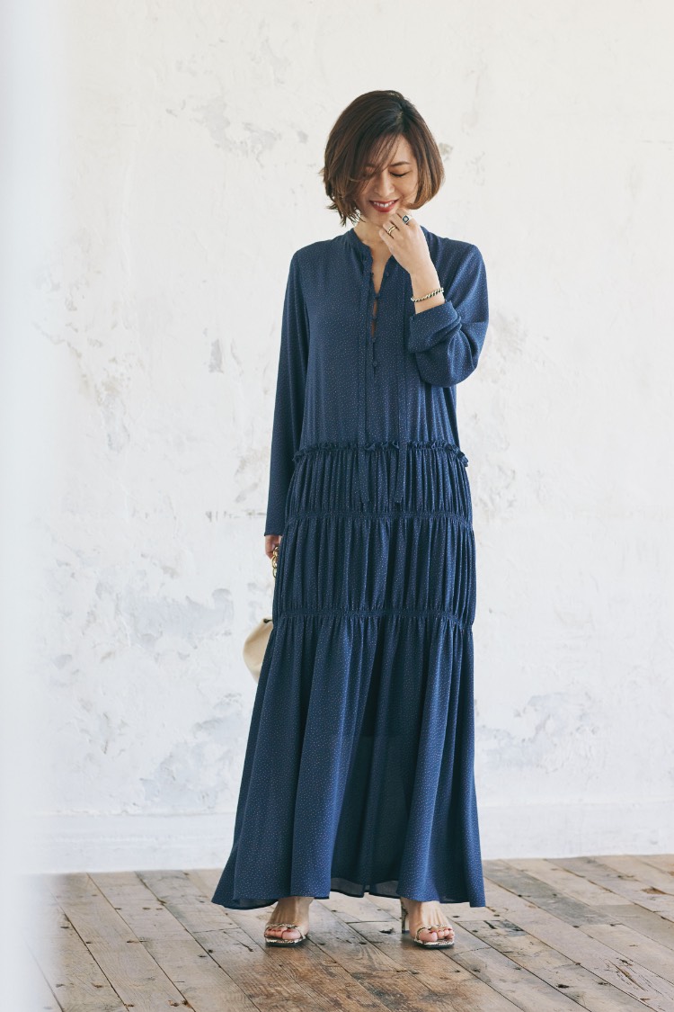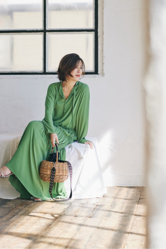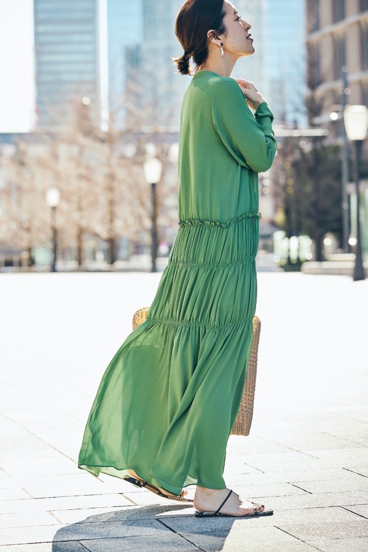「おしゃれの楽しさ」の波は、まるでさざ波のように静かに周りに伝わっていくもの。「きれいね」「似合うわ」、そんなコミュニケーションを運んでくれるワンピース。 「とろみのある素材が、着る人の“コク”を生み、ボディラインを柔らかく包む美しいドレープが、仕草だってきれいに見せてくれるワンピース。リラックスしているのに、決して華やかさや女性らしさを手放さない。 そう、パリの女は、良い意味で“欲張り”。何も諦めず、着るだけでその日のおしゃれは完成し、朝はゆっくりとカフェオレを飲む。そうして、涼しい顔で出かけよう。パリに住む彼女たちのように、“まるで何も計算していないような風情”で」。