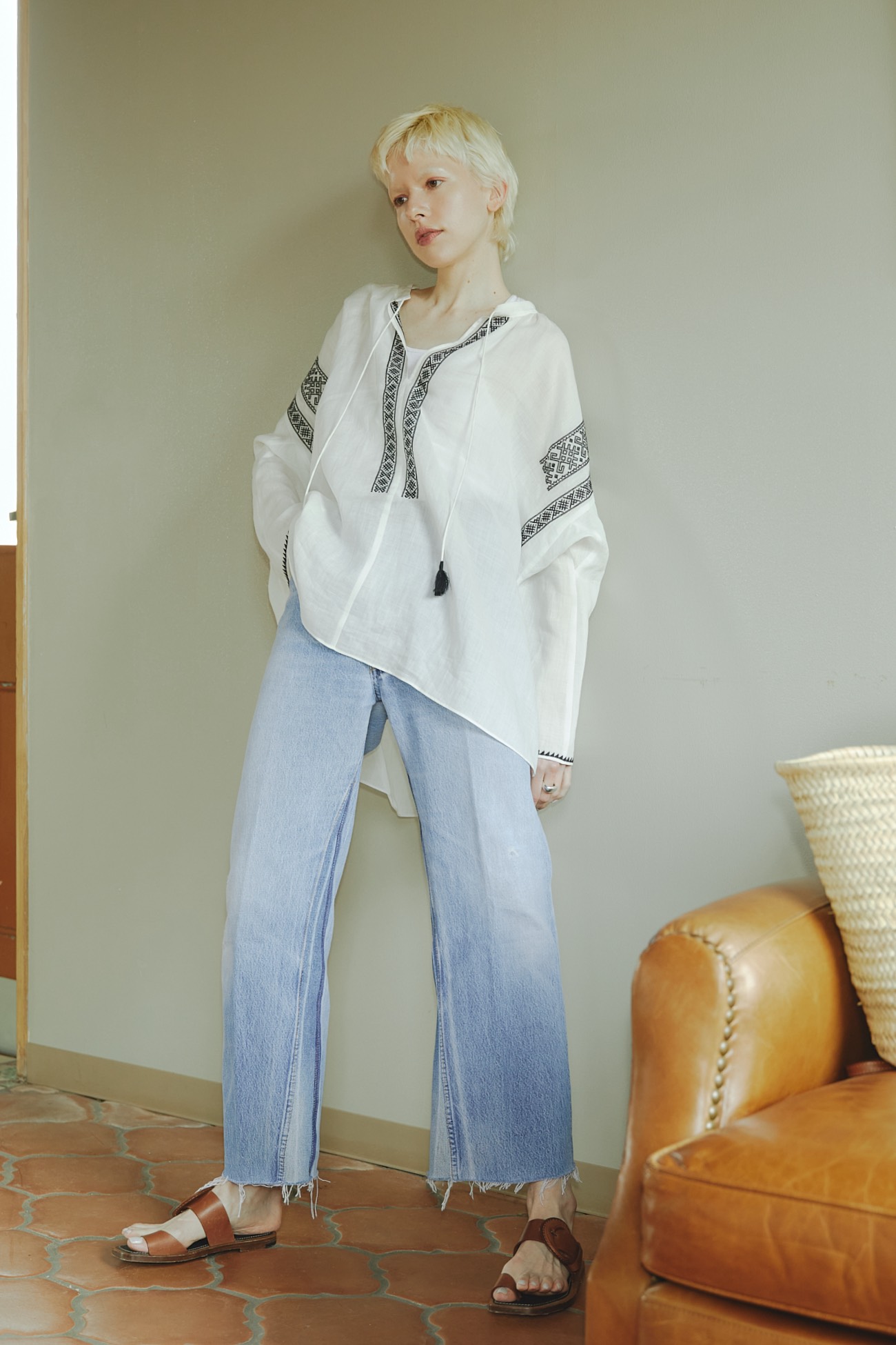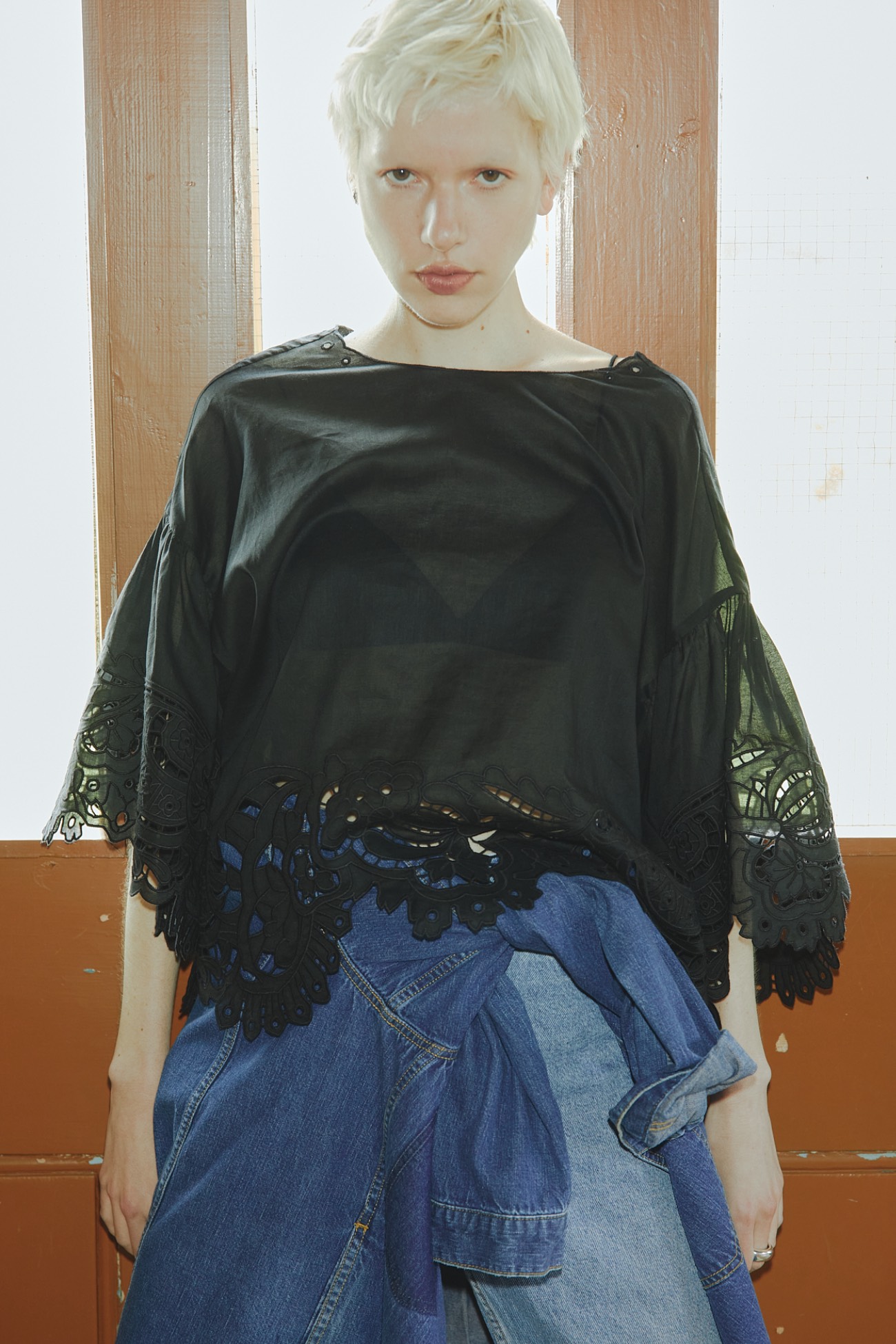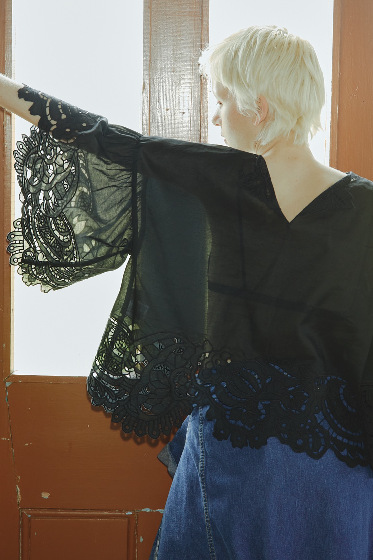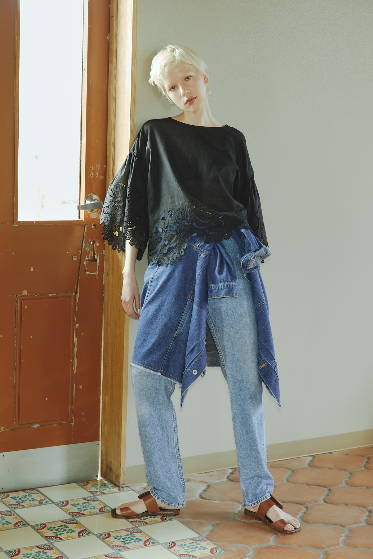 カットレースのブラウスがボーイッシュになりがちなデニムを