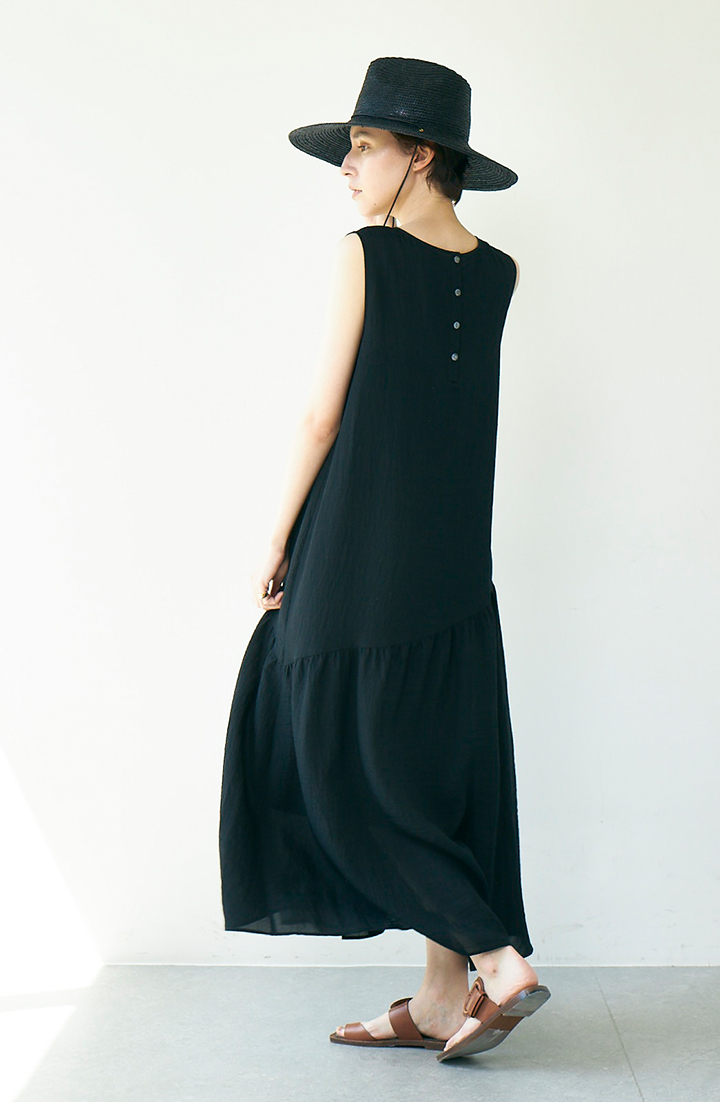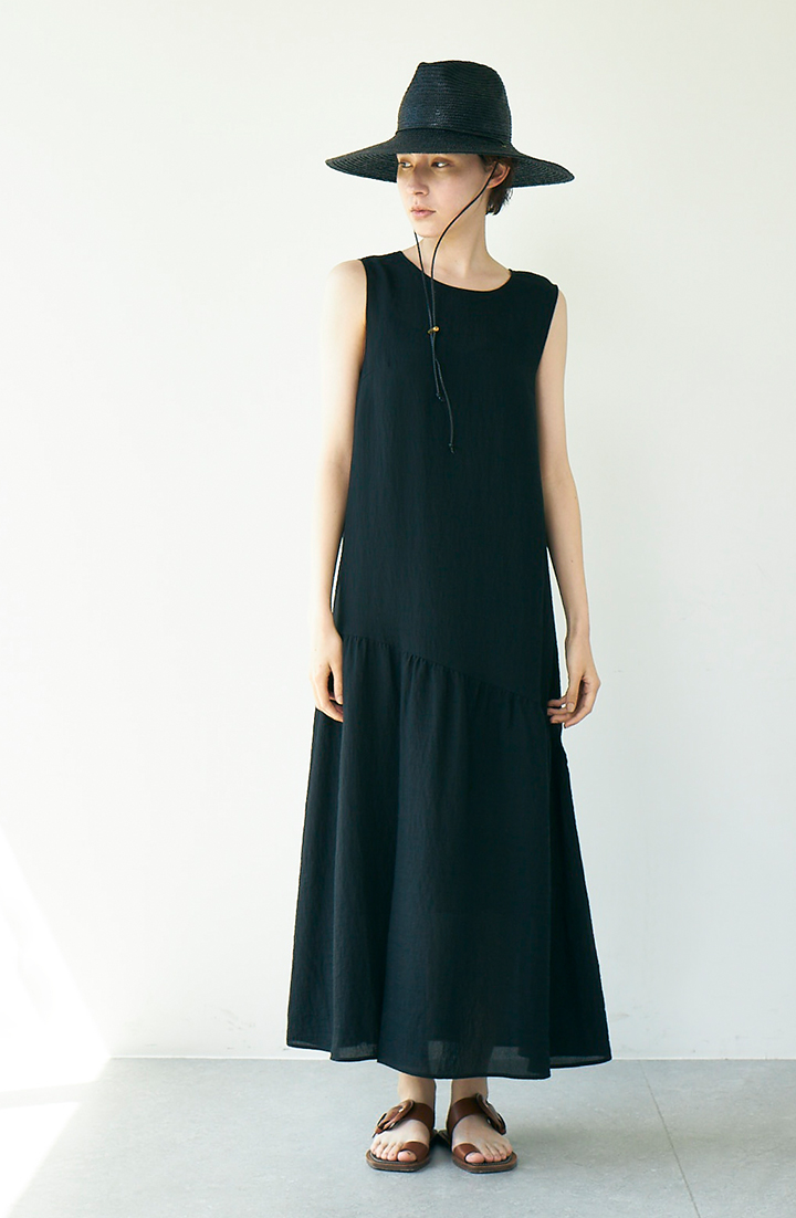 こちらのロングワンピースは、ローウエスト部分で切り替えを施してあり、愛らしいシルエット。黒1色でも単調に見えないのは、この切り替えのおかげです。一般的な切り替えは、横一直線が多いものですが、こちらはアシンメトリーな切り替え。静かな動きを寄り添わせてくれます。こだわりを感じさせる、きめ細やかなディテールです。