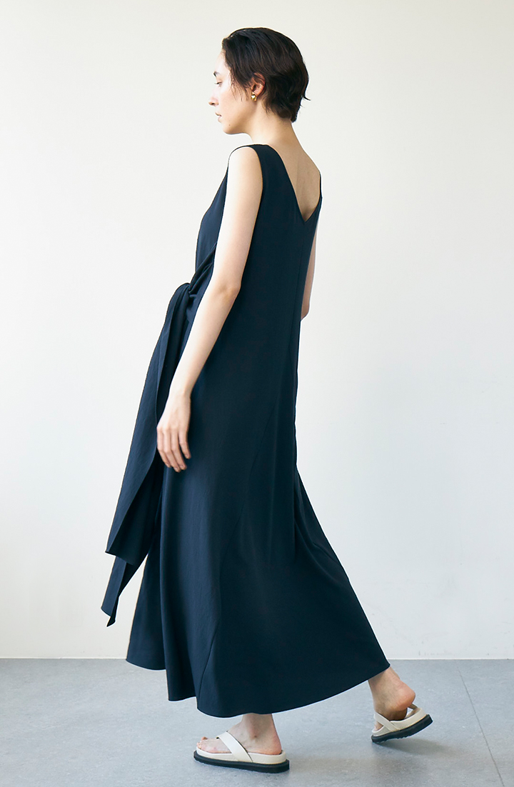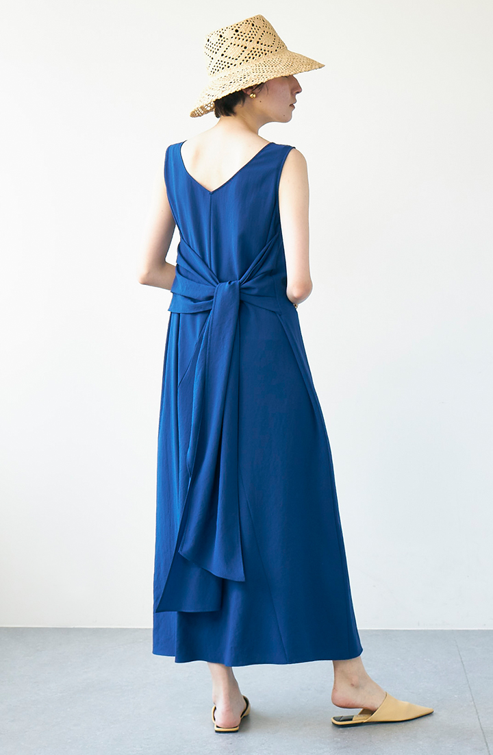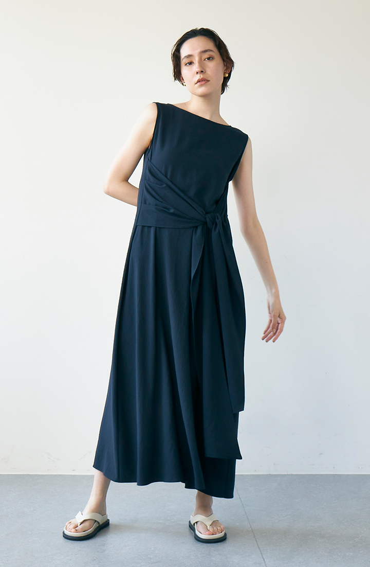 着回し力の高さを裏付けているのは、ウエストに配したロングリボン。実に4wayでのアレンジが可能です。ロングリボンの結び方やポジション次第で、シルエットも雰囲気も様変わり。リボンならではの表情で上品見えするのに加え、ボディラインも自然もカムフラージュできます。