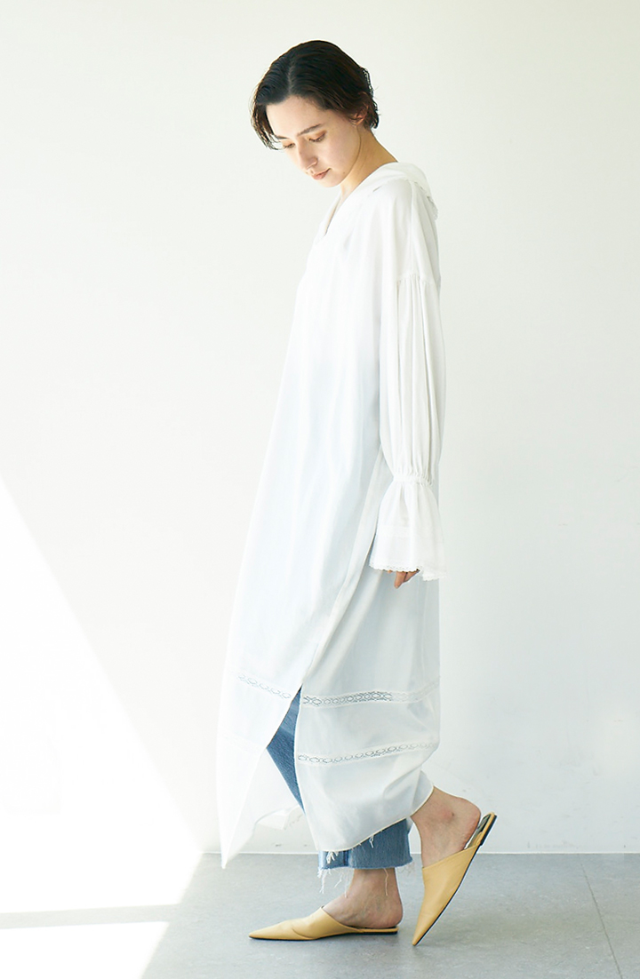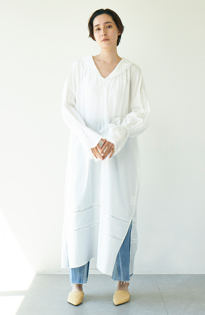 細部に施したアレンジが表情に深みを与えました。たとえば、手首のあたりでいったん絞って、再び袖先に向かってふくらませた「袖コンシャス」。ギャザーやフリルをあちこちにあしらって、コットンの風合いを引き立てているのも素敵な工夫ポイントです。