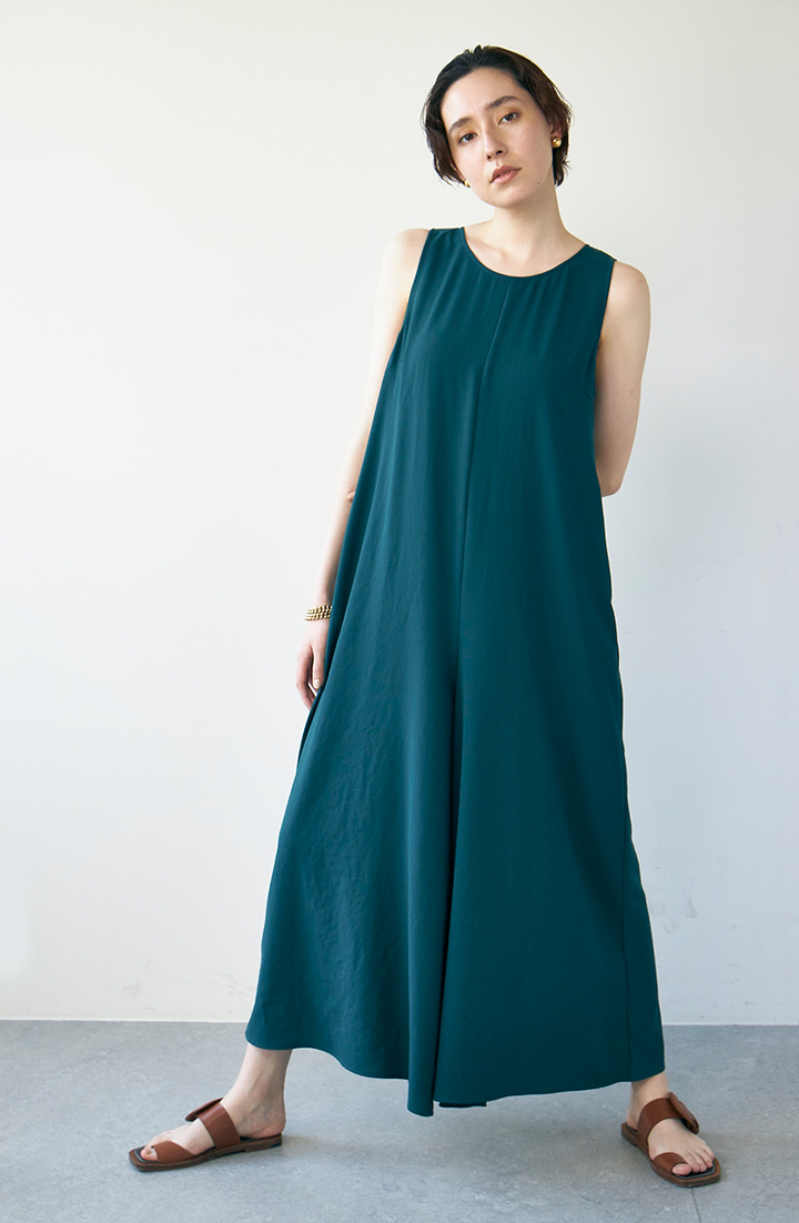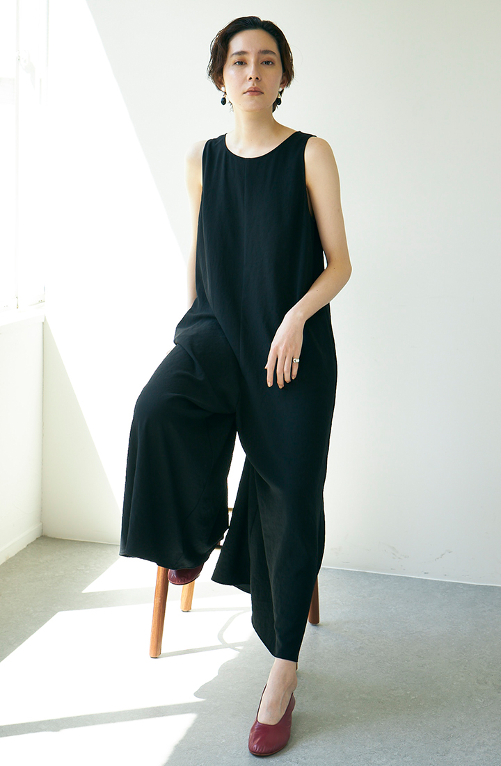 一方、トップス部分はコンパクトなつくり。ノースリーブに加え、素肌に付かず離れずのフォルムだから、ボリューミーなパンツ部分とのめりはりが際立つ仕掛け。自然なスレンダー感も備わりました。