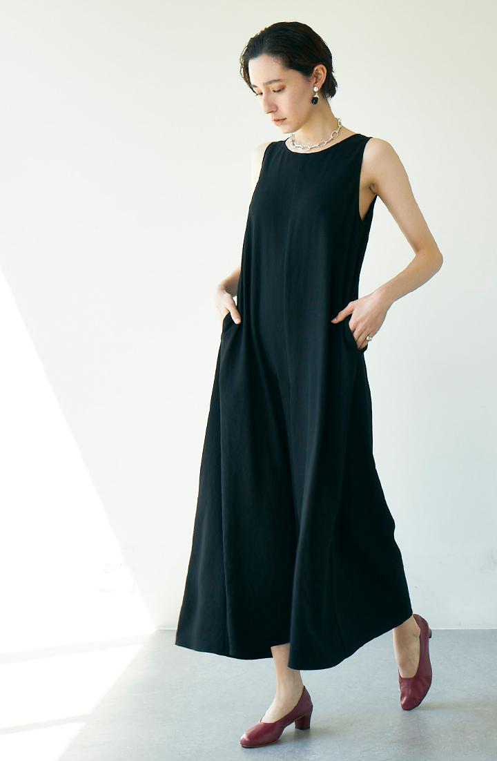 このところ一気にブームが盛り上がってきたアイテムがパンツ型ワンピースの「オールインワン」です。パンツ部分の幅がたっぷりあるタイプは、ほとんどワンピースドレスのような着映え。動きやすさと上品テイストが同居するスグレモノです。