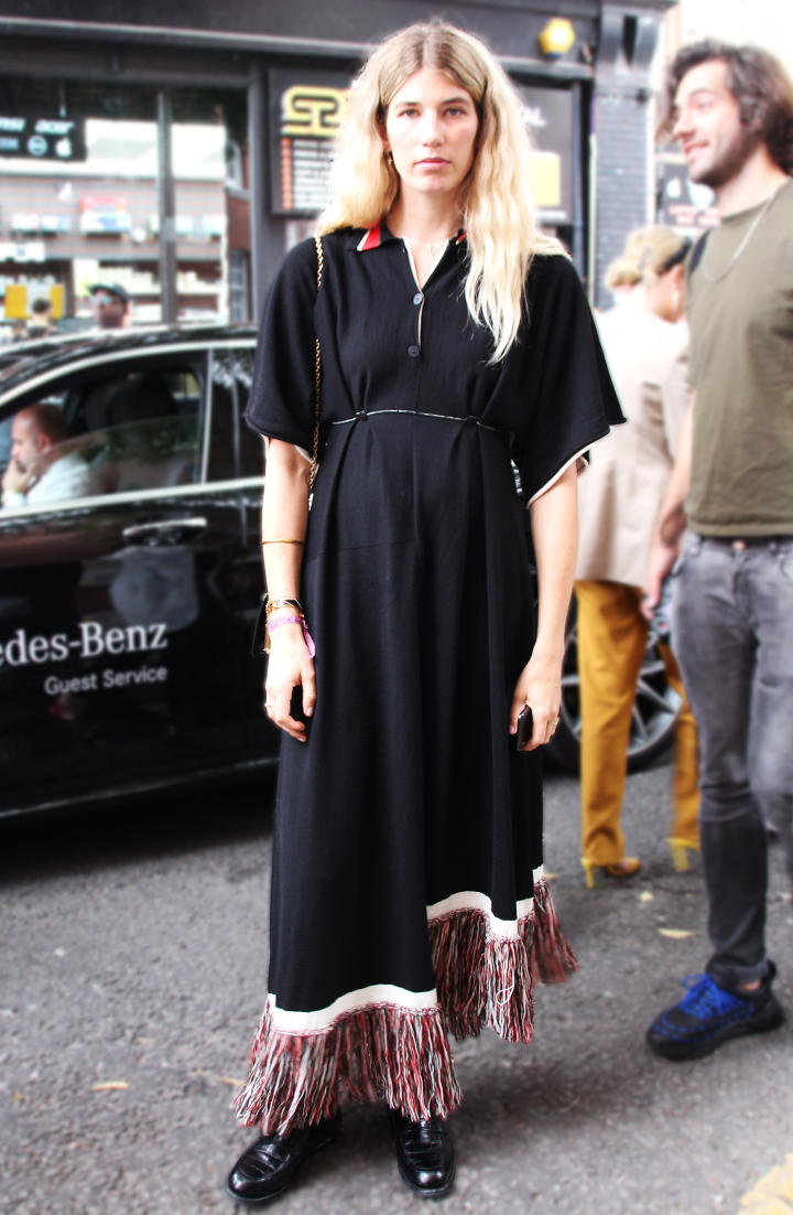 カフタン調ドレスを黒でシックに着こなしたファッショニスタ。裾にどっさりとフリンジが施され、歩くたびに揺らめきを演出。縦長効果と落ち感をいっそう際立たせています。黒と好相性を発揮するゴールド系のアクセサリーで、リッチ感もプラス。サマールックのお約束的なサンダルではなく、あえてローファー靴で「ずれ感」を醸し出しているところにも注目。装いに上級スパイスが添えられました。