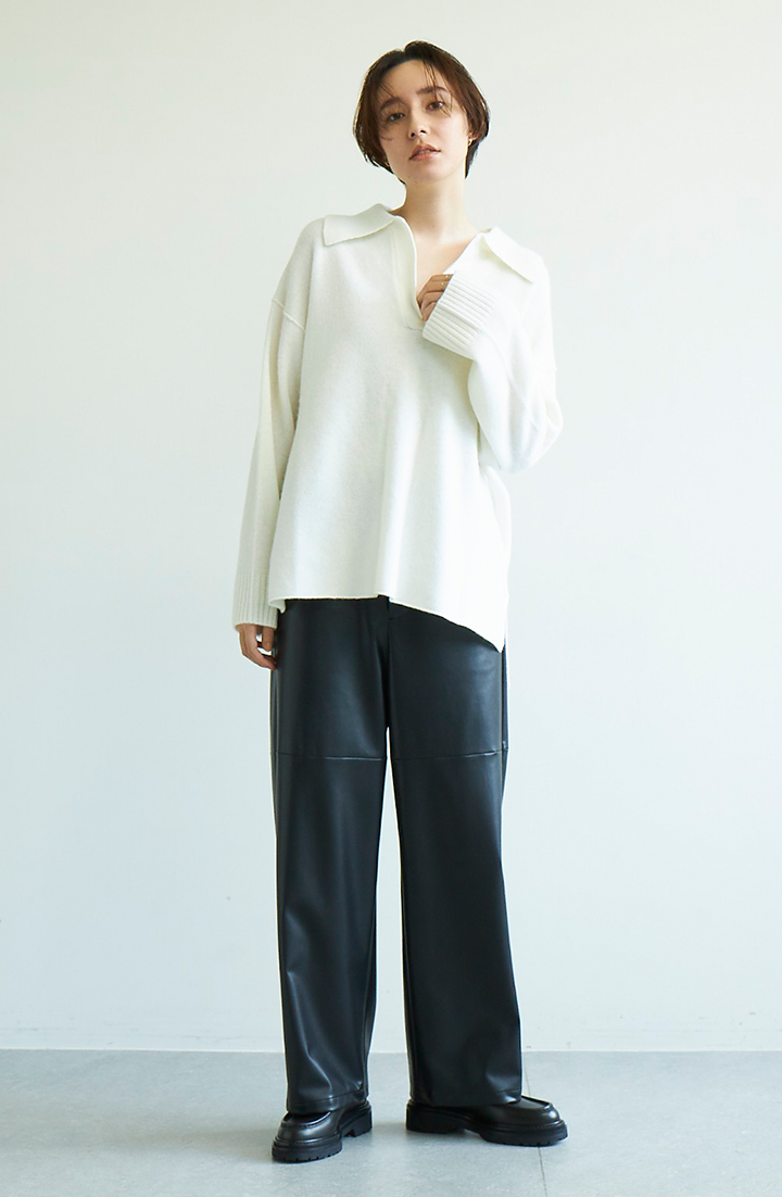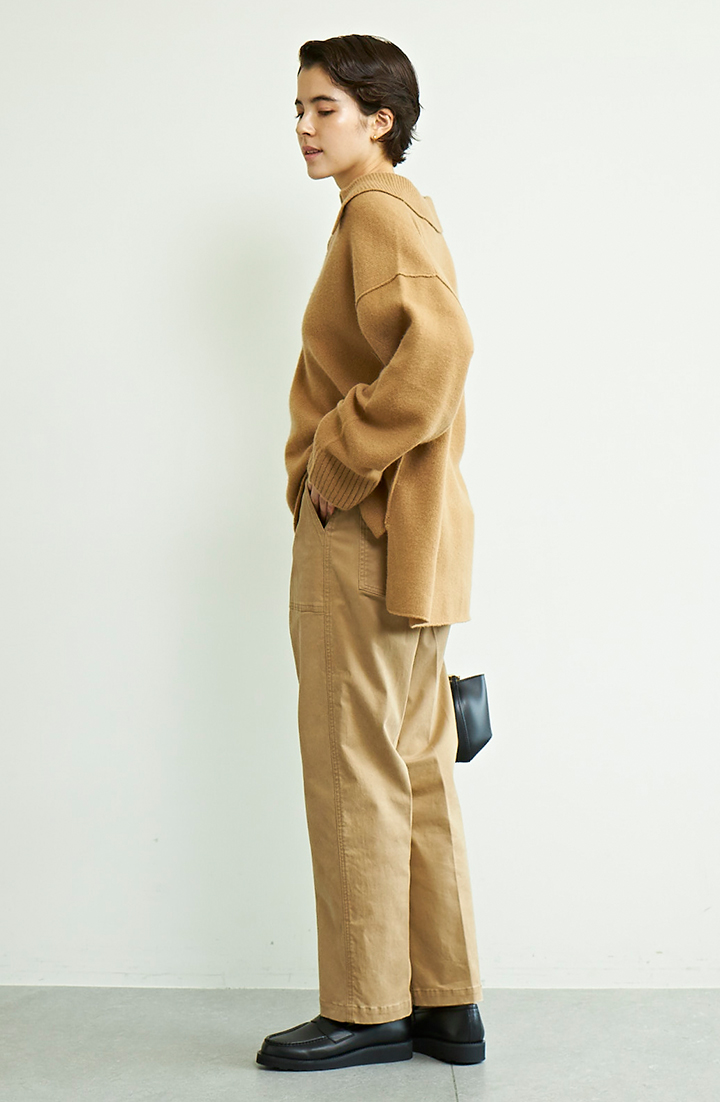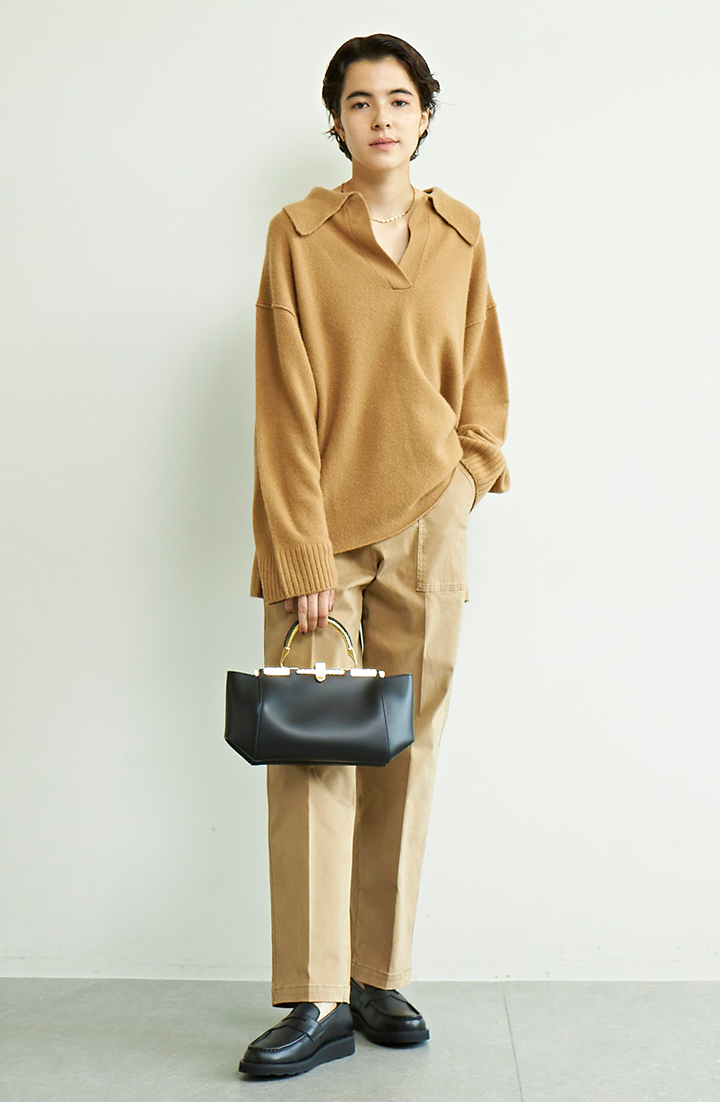 自然な開き加減に整うから、リラクシングな風情に映るのは、キーネックならではのよさ。パンツやマニッシュ靴で合わせても、メンズライクに見えすぎません。色はコーディネートの幅が広いキャメルとホワイトの2色から選べます。