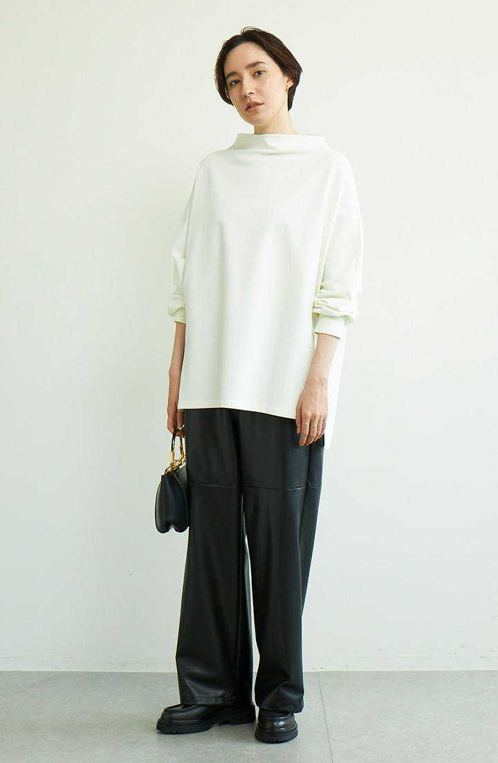 首に沿うスタンドネックでも、窮屈感がないのは、肌当たりのソフトな素材で編み上げたニットだから。素肌に付かず離れずの着心地なので、ストレスフリーに過ごせます。ネックラインに少しだけ高さがある分、上品に映ります。首周りが開きすぎないから、リモートワークの画面でもルーズに見えません。色はボトムスとの相性を選ばないホワイトとブラックが用意されました。