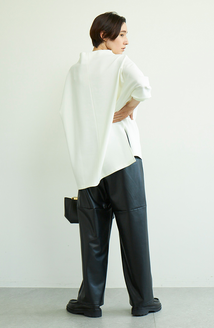先のキーネックと同じく、前後で着丈が異なる点を生かした着こなしを試せます。たとえば、正面側の裾だけをウエストインすれば、さらに前後のアシンメトリー感が強まり、落ち感もアップ。背中側はヒップが隠れる長さがあり、体型カバーにも効果的です。