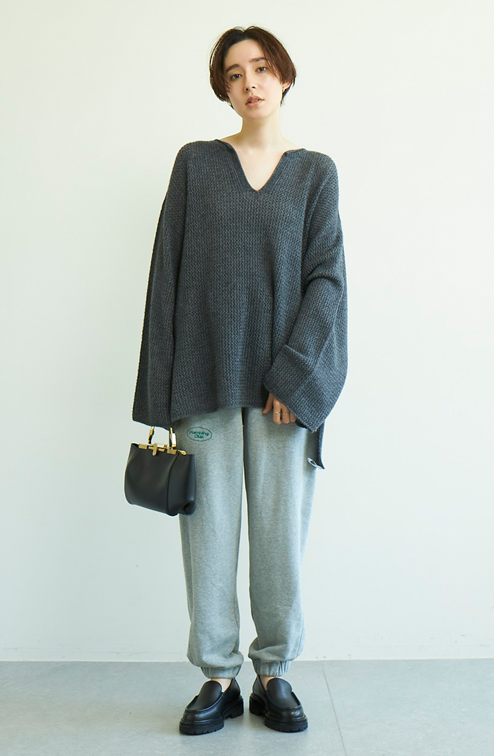身頃にスペースのゆとりがある分、秋から先は内側にシャツやタートルネックなどを着込んでレイヤードを組み立てやすくなっています。1枚使いと重ね着を使い分ければ、ほとんどオールシーズンで着回せる重宝ニットと言えるでしょう。