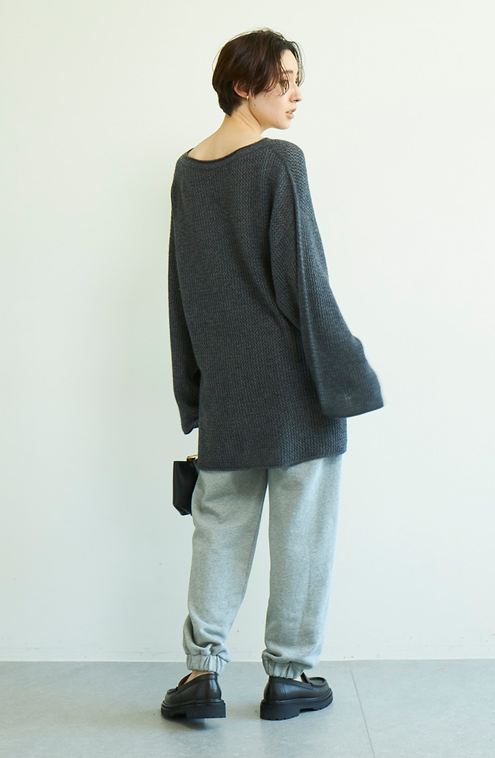 オーバーサイズまではいかない程度の、ややゆったりしたサイズ感は、伸びやかな着心地に誘います。袖口が広めにとってあるので、腕を動かしたときの袖アクションが目を引き込みます。指先がのぞく長めの袖丈も華奢感を引き出すディテールです。
