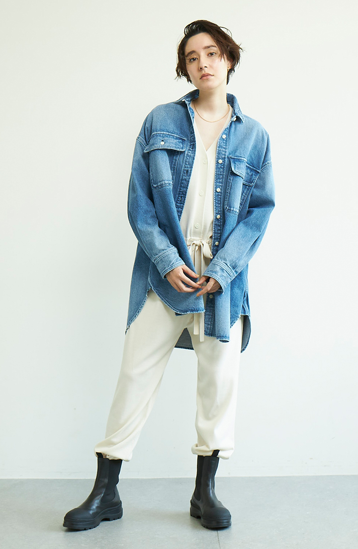 オーバーサイズのデニムシャツは、デニムジャケット風に羽織れるから、シーズンを超えて便利に使えます。ジャケットよりも軽やかに着られるうえ、前を開けて、カーディガンのようにサラッとまとえるのは、着丈が長めのタイプならではの長所です。