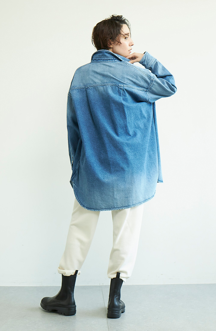シルエットの余裕がある分、着やせして映る効果が期待できます。ヒップが隠れる着丈があるので、縦落ち感もしっかり。ボディラインをぼかす仕事も引き受けてもらえます。メンズシャツのムードを、ウィメンズの装いに取り込める頼もしい1着です。色はブルーデニムとブラックデニムの2色での提案となっています。